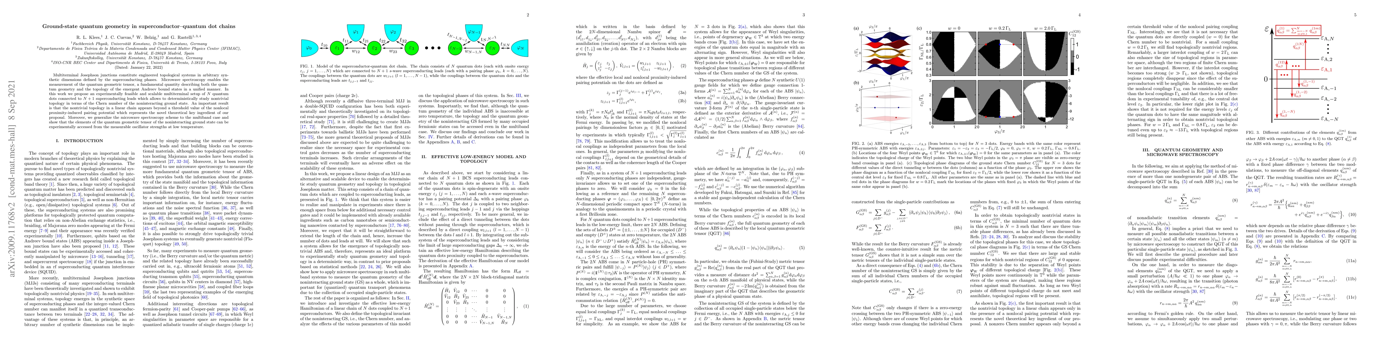 Multiterminal Josephson junctions constitute engineered topological systems in arbitrary synthetic dimensions defined by the superconducting phases. Microwave spectroscopy enables the measurement of the quantum geometric tensor, a fundamental quantity describing both the quantum geometry and the topology of the emergent Andreev bound states in a unified manner. In this work we propose an experimentally feasible multiterminal setup of $N$ quantum dots connected to $N+1$ superconducting leads to study nontrivial topology in terms of the many-body Chern number of the ground state. Moreover, we generalize the microwave spectroscopy scheme to the multiband case and show that the elements of the quantum geometric tensor of the noninteracting ground state can be experimentally accessed from the measurable oscillator strengths at low temperature.