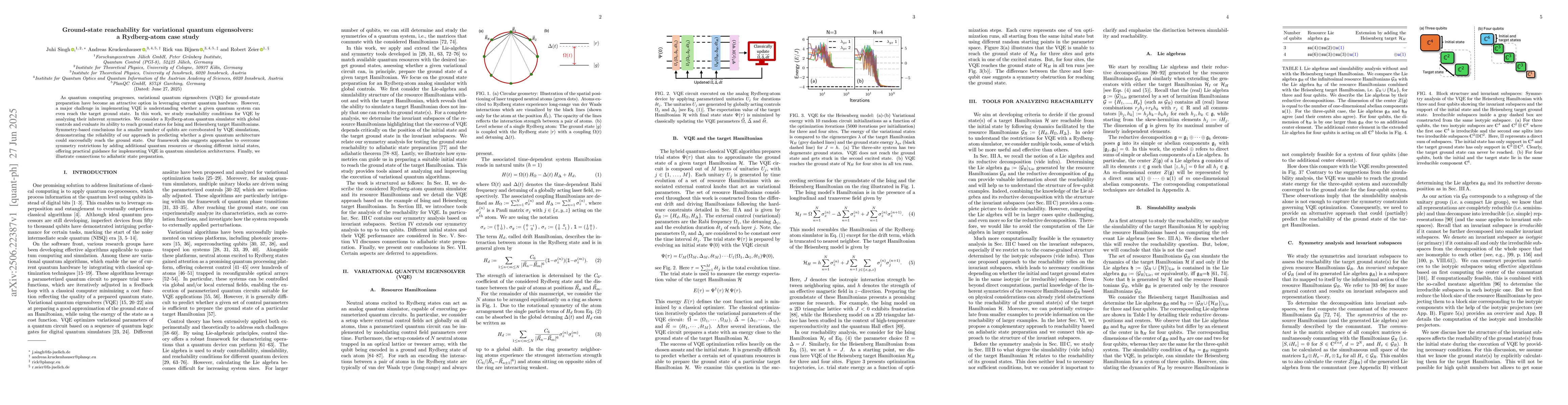 As quantum computing progresses, variational quantum eigensolvers (VQE) for ground-state preparation have become an attractive option in leveraging current quantum hardware. However, a major challenge in implementing VQE is understanding whether a given quantum system can even reach the target ground state. In this work, we study reachability conditions for VQE by analyzing their inherent symmetries. We consider a Rydberg-atom quantum simulator with global controls and evaluate its ability to reach ground states for Ising and Heisenberg target Hamiltonians. Symmetry-based conclusions for a smaller number of qubits are corroborated by VQE simulations, demonstrating the reliability of our approach in predicting whether a given quantum architecture could successfully reach the ground state. Our framework also suggests approaches to overcome symmetry restrictions by adding additional quantum resources or choosing different initial states, offering practical guidance for implementing VQE in quantum simulation architectures. Finally, we illustrate connections to adiabatic state preparation.