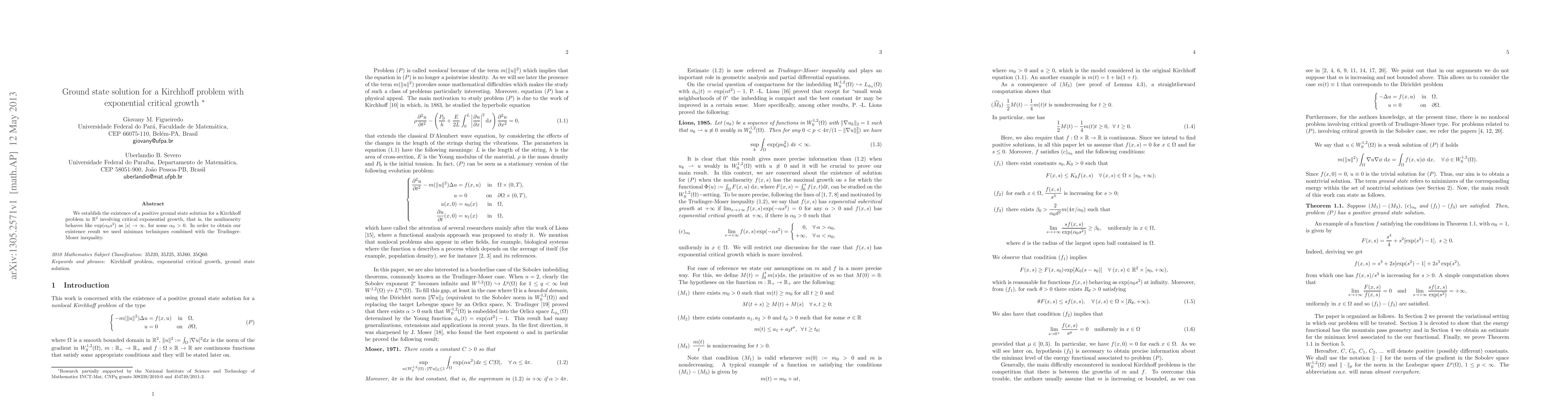 This paper establishes the existence of a positive ground state solution for a Kirchhoff problem in $\mathbb{R}^2$ with critical exponential growth nonlinearity. The authors utilize minimax techniques and the Trudinger-Moser inequality to achieve their result.