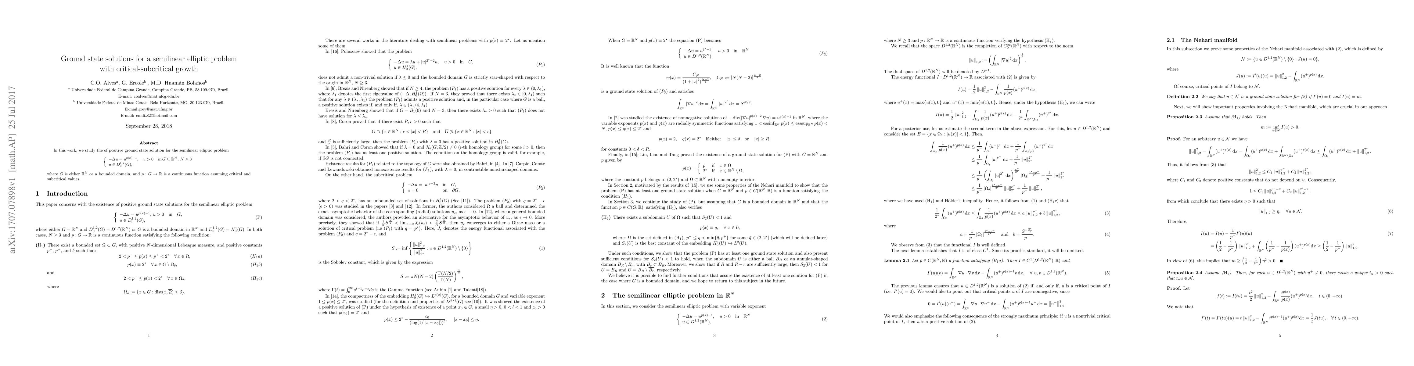 In this work, we study the of positive ground state solution for the semilinear elliptic problem $$ \left\{ \begin{array} [c]{ll}% -\Delta u=u^{p(x)-1},\quad u>0 & \mathrm{in}\,G\subseteq\mathbb{R}^{N}% ,\,N\geq3\\ u\in D_{0}^{1,2}(G), & \end{array} \right. $$ where $G$ is either $\mathbb{R}^{N}$ or a bounded domain, and $p:G\rightarrow \mathbb{R}$ is a continuous function assuming critical and subcritical values.