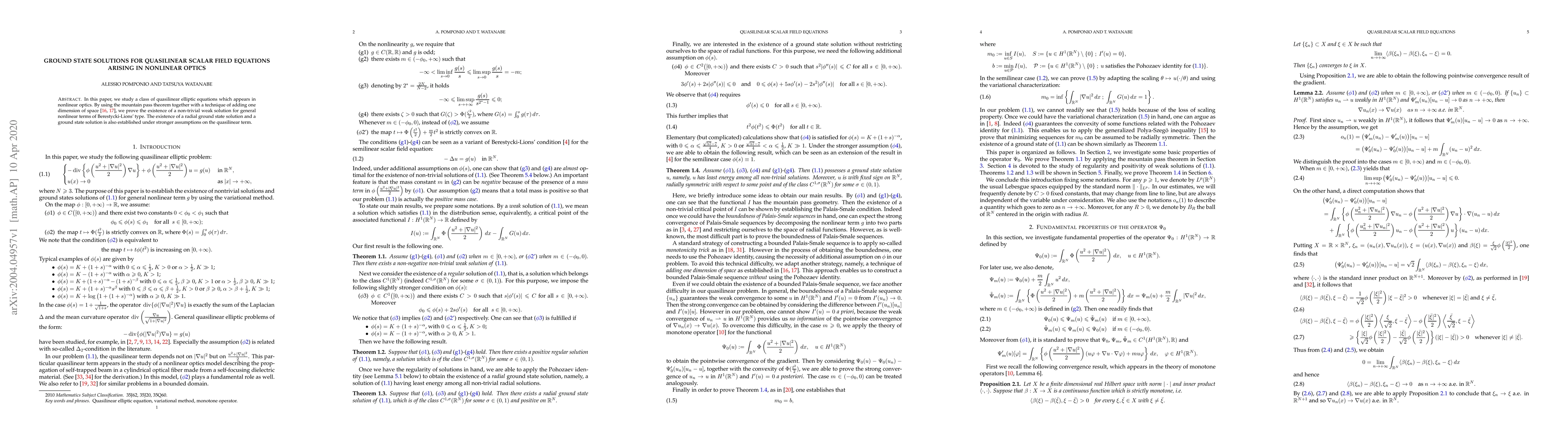 This paper explores quasilinear elliptic equations relevant to nonlinear optics, proving the existence of non-trivial weak solutions via the mountain pass theorem and adding an extra spatial dimension. It also establishes radial and general ground state solutions under specific conditions.