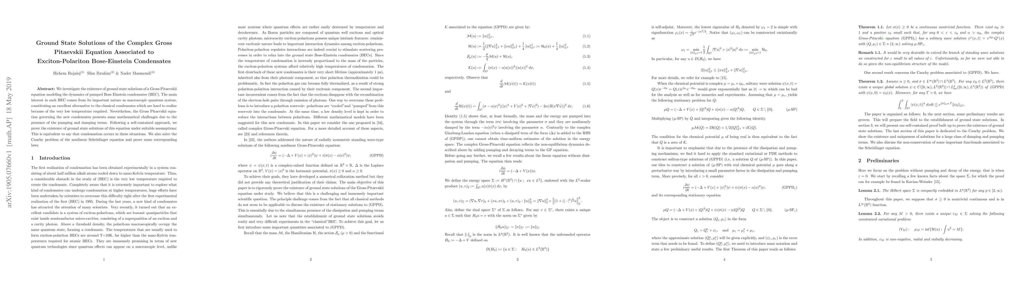 This paper investigates the existence of ground state solutions for the complex Gross-Pitaevskii equation modeling exciton-polariton Bose-Einstein condensates, proving their existence under certain assumptions and addressing the mathematical challenges posed by the pumping and damping terms. The study also solves the Cauchy problem for the nonlinear Schrödinger equation.
