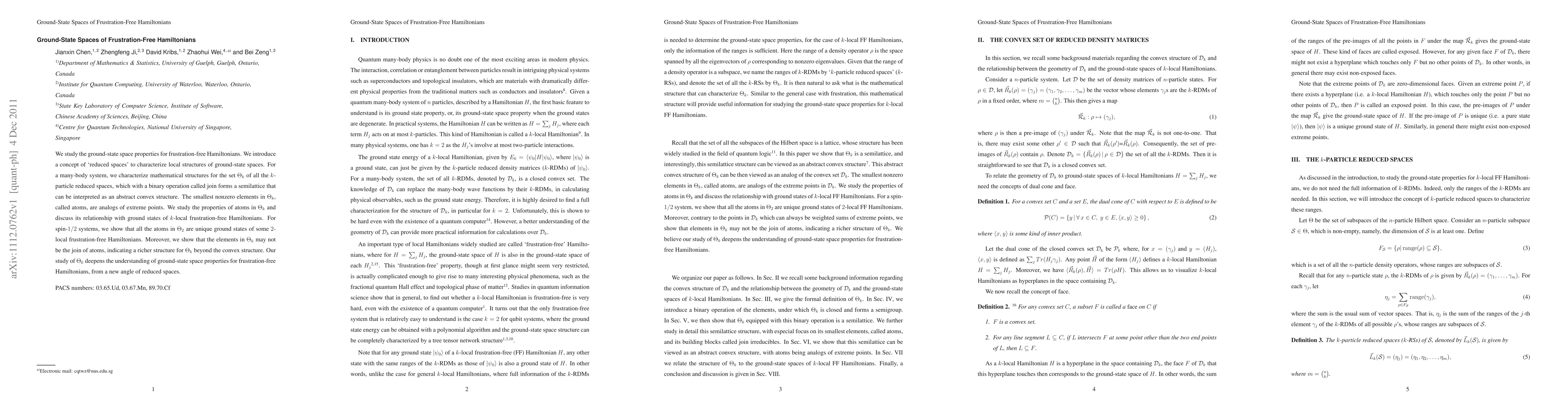 This paper investigates the ground-state space properties of frustration-free Hamiltonians, introducing "reduced spaces" to characterize local structures. It reveals that the set of $k$-particle reduced spaces forms a semilattice, with atoms analogous to extreme points, and discusses the unique ground states for spin-1/2 systems.