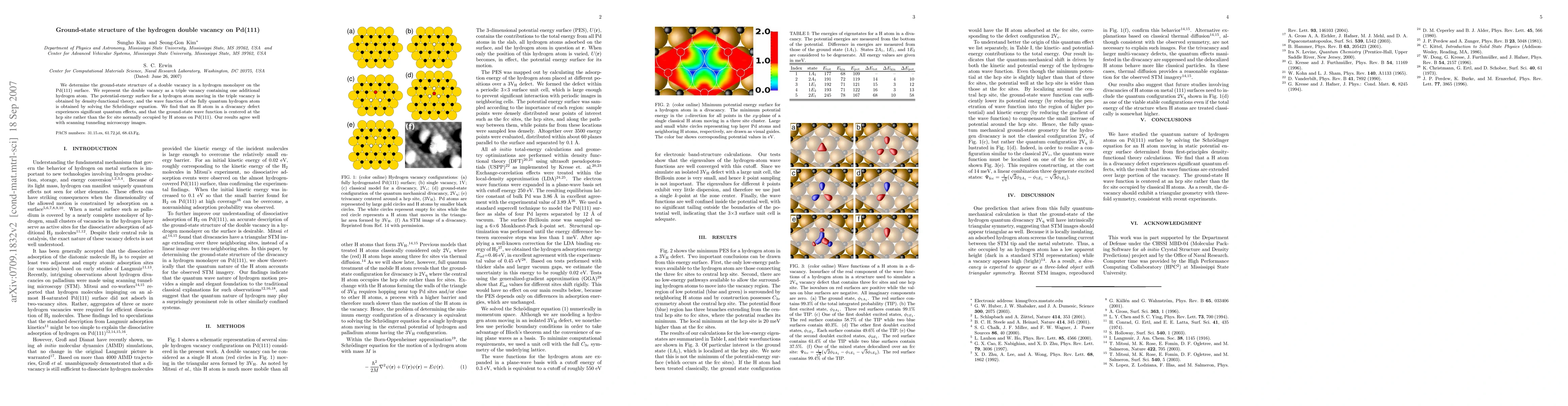 We determine the ground-state structure of a double vacancy in a hydrogen monolayer on the Pd(111) surface. We represent the double vacancy as a triple vacancy containing one additional hydrogen atom. The potential-energy surface for a hydrogen atom moving in the triple vacancy is obtained by density-functional theory, and the wave function of the fully quantum hydrogen atom is obtained by solving the Schr\"odinger equation. We find that an H atom in a divacancy defect experiences significant quantum effects, and that the ground-state wave function is centered at the hcp site rather than the fcc site normally occupied by H atoms on Pd(111). Our results agree well with scanning tunneling microscopy images.