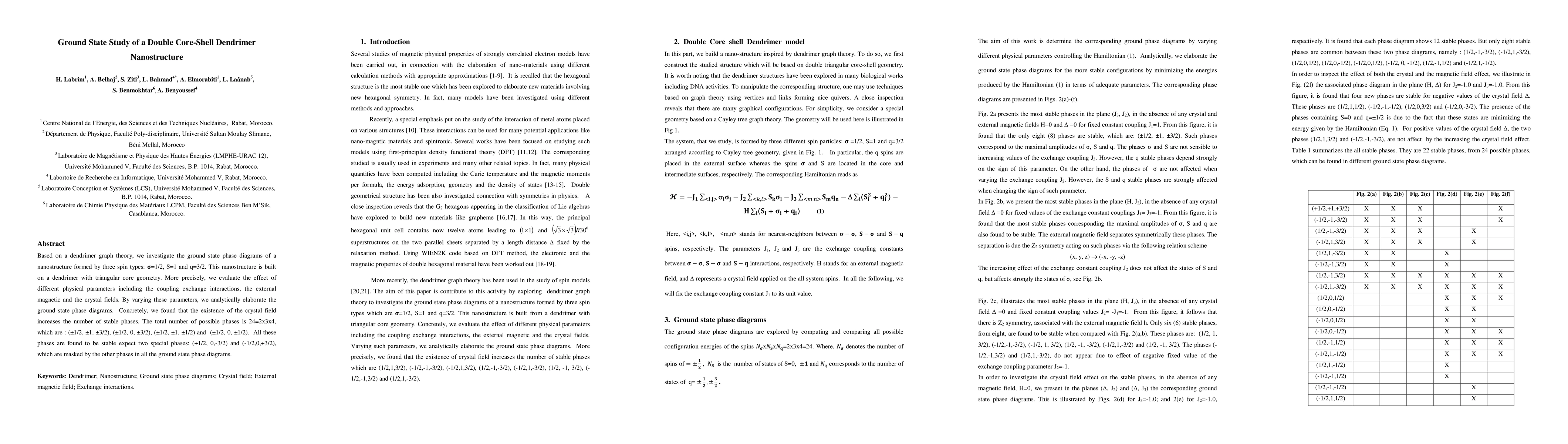 Based on a dendrimer graph theory, we investigate the ground state phase diagrams of a nanostructure formed by three spins: $\sigma=1/2$, S=1 and q=3/2. This nanostructure is built on a dendrimer with triangular core geometry. More precisely, we evaluate the effect of different physical parameters including the exchange interactions, the external magnetic and the crystal fields. By varying these parameters, we analytically elaborate the ground state phase diagrams. Concretely, we found that the existence of the crystal field increases the number of stable phases. The total number of possible phases is 24=2x3x4, which are: ($\pm$1/2,$\pm$1,$\pm$3/2), ($\pm$1/2,0,$\pm$3/2), ($\pm$1/2,$\pm$1,$\pm$1/2) and ($\pm$1/2,0,$\pm$1/2). All these phases are found to be stable, expect two special phases: (+1/2,0,-3/2) and (-1/2,0,+3/2), which are masked by the other phases in all the ground state phase diagrams.