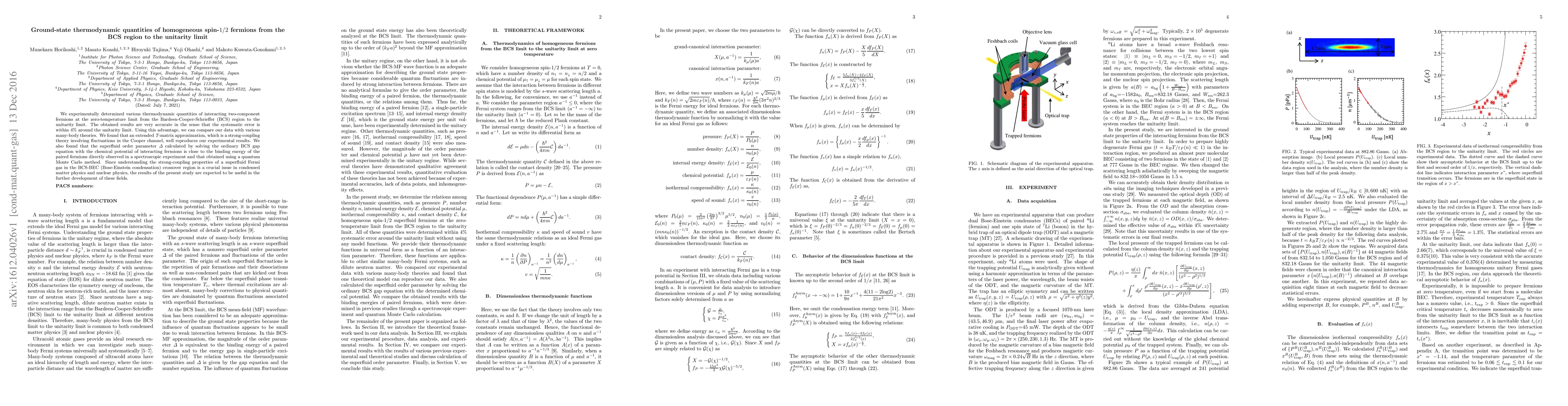This research experimentally determines thermodynamic quantities of interacting spin-$1/2$ fermions from BCS to unitarity, finding that an extended $T$-matrix approximation accurately reproduces the results. The study's findings are significant for understanding strong-coupling superfluid properties in the BCS-BEC crossover.
