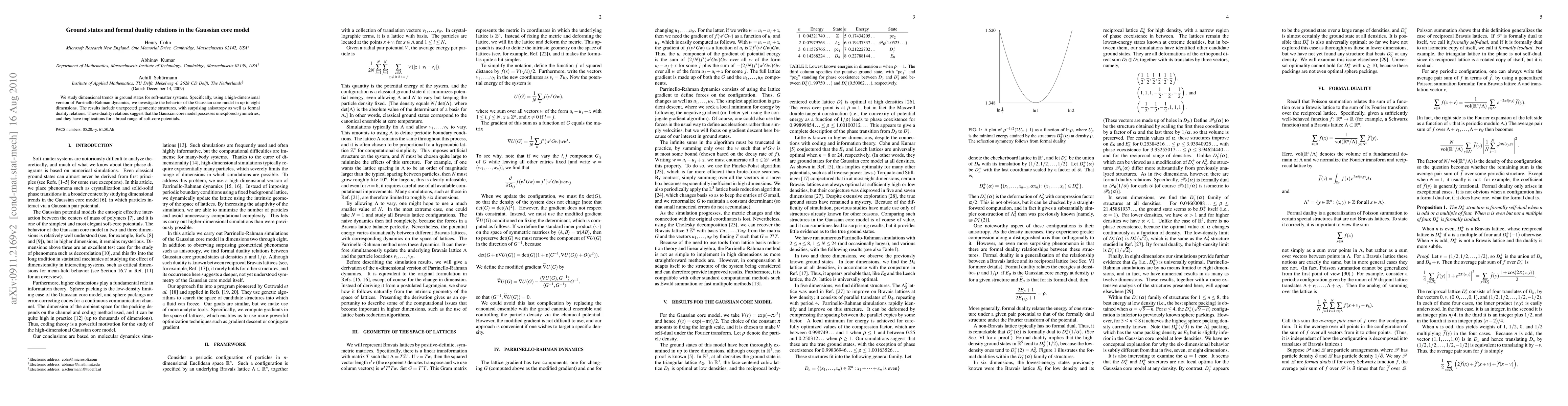 This paper investigates the ground states of the Gaussian core model in up to eight dimensions using high-dimensional Parrinello-Rahman dynamics, revealing unexpected geometric structures and surprising anisotropy. It uncovers formal duality relations suggesting unexplored symmetries in the model with implications for various soft-core potentials.