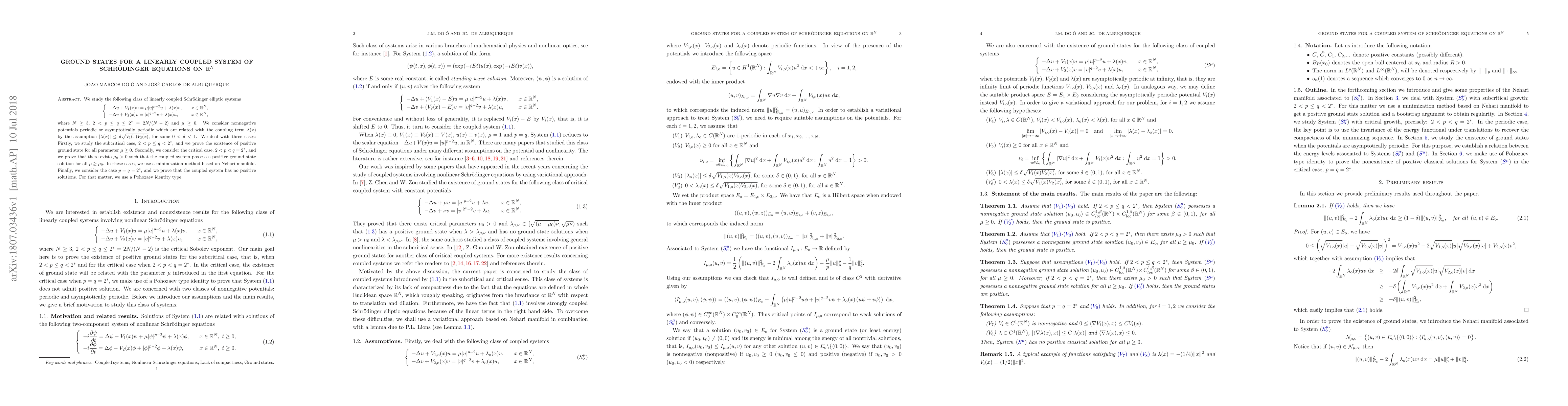 We study the following class of linearly coupled Schr\"{o}dinger elliptic systems $$\left\{ \begin{array}{lr} -\Delta u+V_{1}(x)u=\mu|u|^{p-2}u+\lambda(x)v, & \quad x\in\mathbb{R}^{N}, \\ -\Delta v+V_{2}(x)v=|v|^{q-2}v+\lambda(x)u, & x\in\mathbb{R}^{N}, \end{array} \right. $$ where $N\geq3$, $2