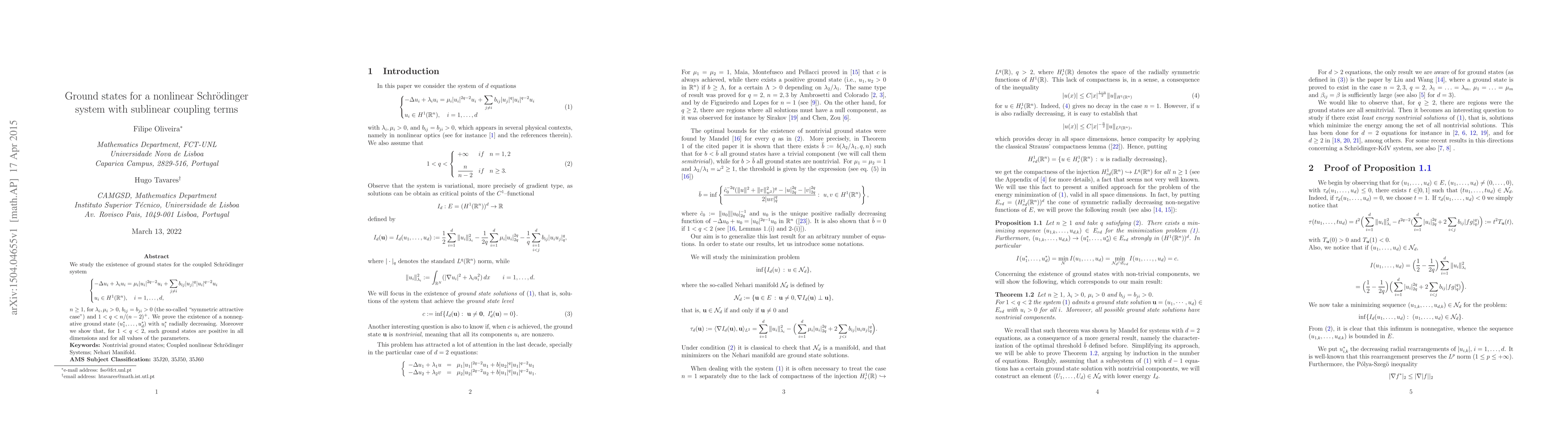 This study proves the existence of nonnegative ground states for a nonlinear Schr"odinger system with sublinear coupling terms, showing that such states can be positive in dimensions 1<q<2.
