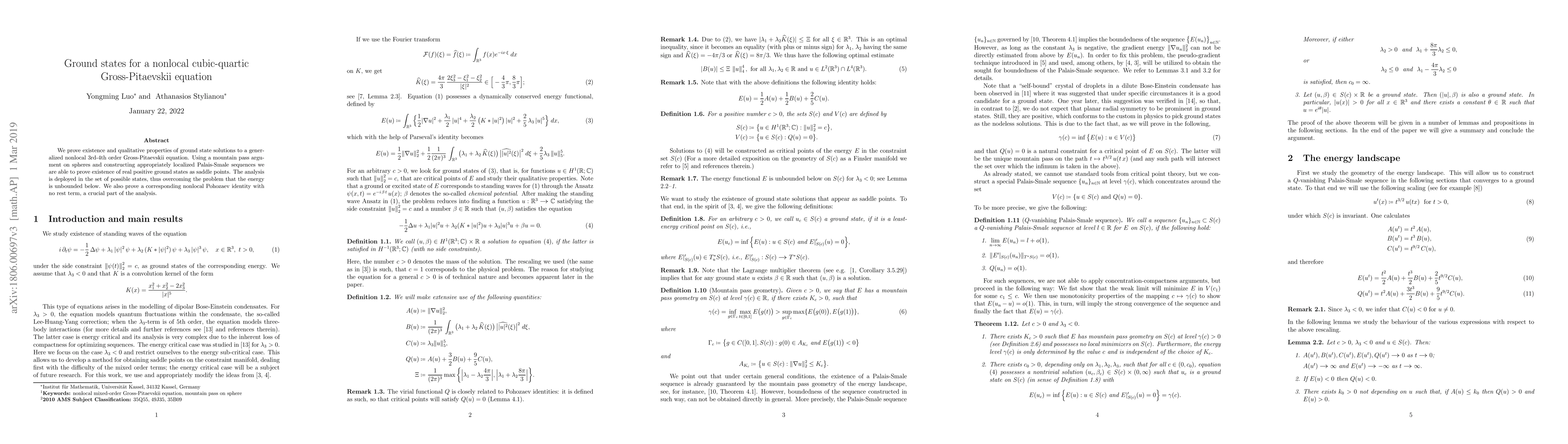 This paper establishes the existence and properties of ground state solutions to a nonlocal cubic-quartic Gross-Pitaevskii equation using a mountain pass theorem and localized Palais-Smale sequences. It also proves a nonlocal Pohozaev identity without a rest term, essential for the analysis.