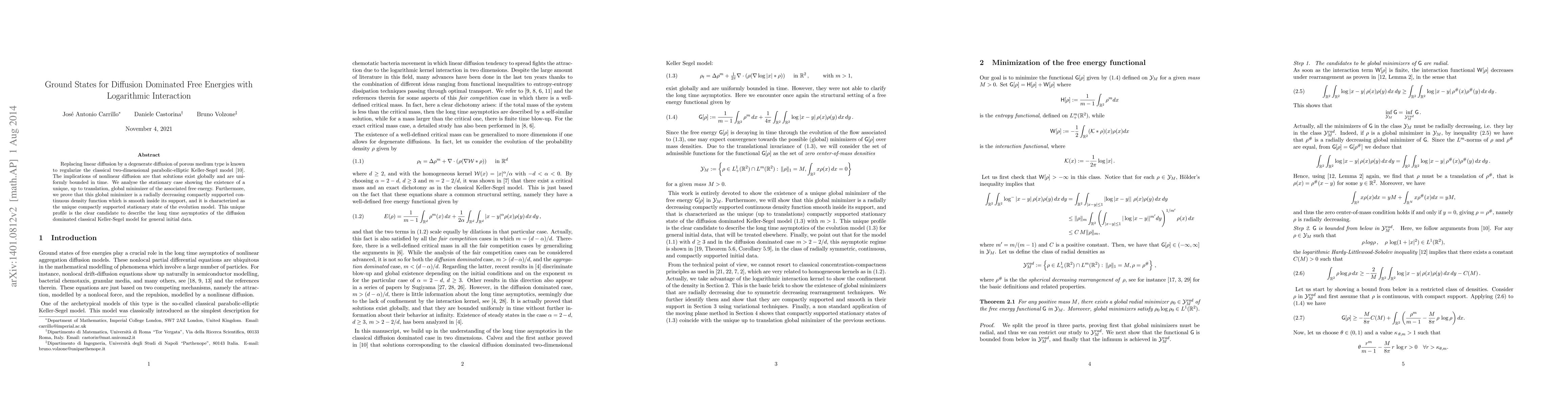 This paper investigates the ground state for diffusion-dominated free energies with logarithmic interaction, focusing on the degenerate diffusion of porous medium type. It establishes the existence of a unique, globally bounded, and radially decreasing stationary state that characterizes the long-time behavior of the classical Keller-Segel model.
