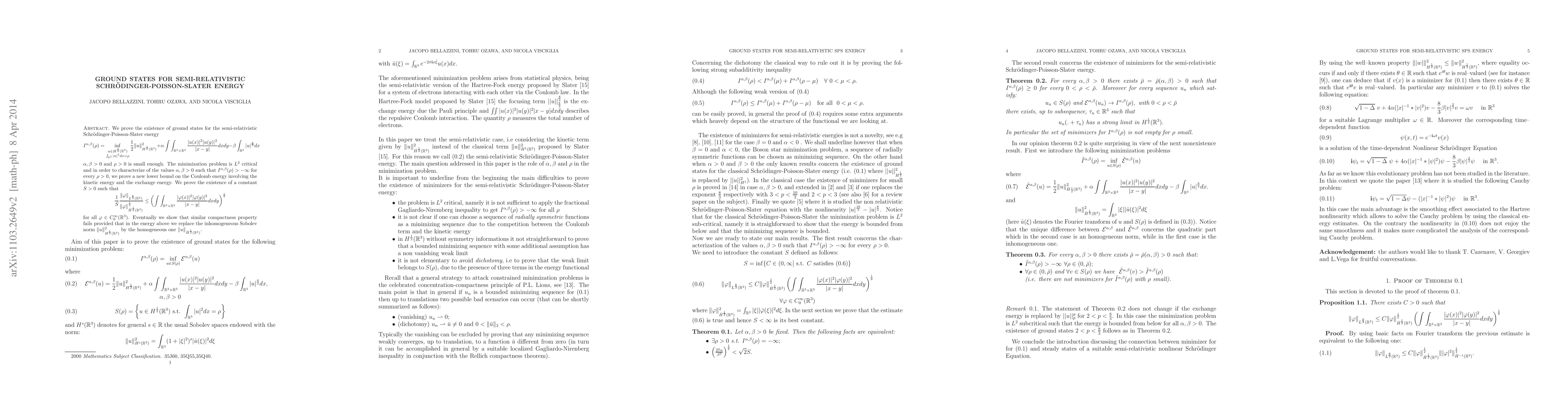 We prove the existence of ground states for the semi-relativistic Schr\"odinger-Poisson-Slater energy $$I^{\alpha,\beta}(\rho)=\inf_{\substack{u\in H^\frac 12(\R^3) \int_{\R^3}|u|^2 dx=\rho}} \frac{1}{2}\|u\|^2_{H^\frac 12(\R^3)} +\alpha\int\int_{\R^{3}\times\R^{3}} \frac{| u(x)|^{2}|u(y)|^2}{|x-y|}dxdy-\beta\int_{\R^{3}}|u|^{\frac{8}{3}}dx$$ $\alpha,\beta>0$ and $\rho>0$ is small enough. The minimization problem is $L^2$ critical and in order to characterize of the values $\alpha, \beta>0$ such that $I^{\alpha, \beta}(\rho)>-\infty$ for every $\rho>0$, we prove a new lower bound on the Coulomb energy involving the kinetic energy and the exchange energy. We prove the existence of a constant $S>0$ such that $$\frac{1}{S}\frac{\|\varphi\|_{L^\frac 83(\R^3)}}{\|\varphi\|_{\dot H^\frac 12(\R^3)}^\frac 12}\leq \left (\int\int_{\R^3\times \R^3} \frac{|\varphi(x)|^2|\varphi(y)|^2}{|x-y|}dxdy\right)^\frac 18 $$ for all $\varphi\in C^\infty_0(\R^3)$. Eventually we show that similar compactness property fails provided that in the energy above we replace the inhomogeneous Sobolev norm $\|u\|^2_{H^\frac 12(\R^3)}$ by the homogeneous one $\|u\|_{\dot H^\frac 12(\R^3)}$.