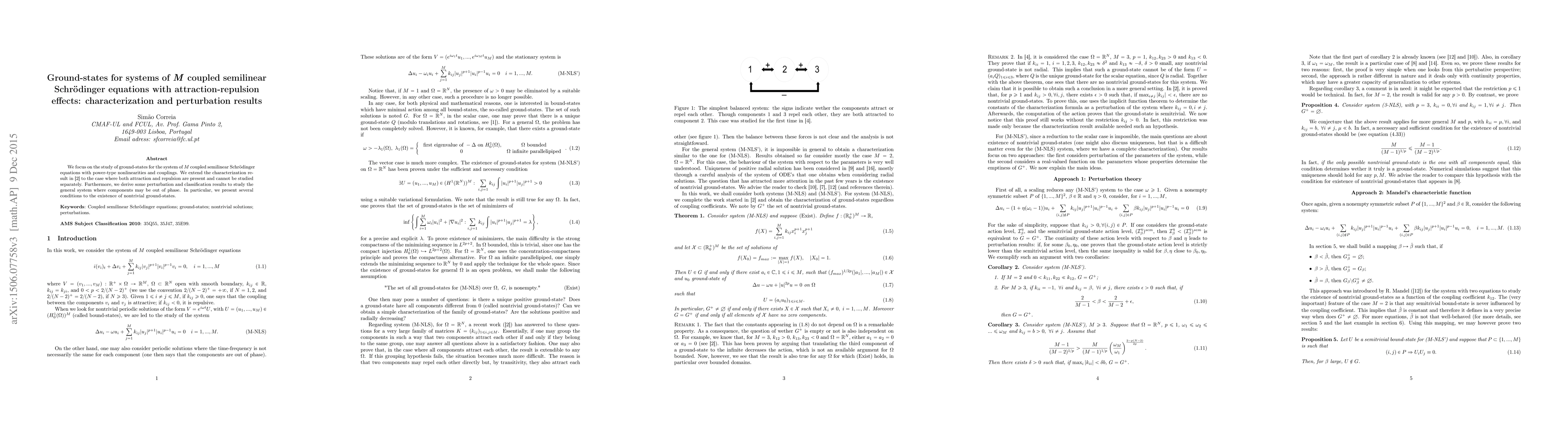 This paper investigates ground-states for systems of $M$ coupled semilinear Schrödinger equations with both attraction and repulsion effects. It extends previous characterization and derives perturbation results, focusing on conditions for the existence of nontrivial ground-states in systems where components may be out of phase.