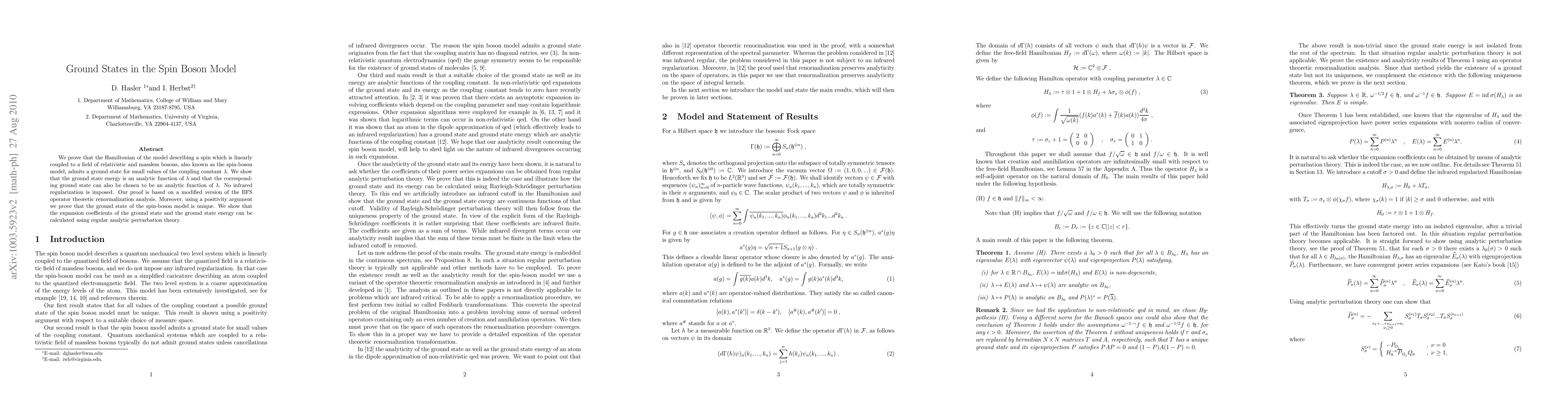 We prove that the Hamiltonian of the model describing a spin which is linearly coupled to a field of relativistic and massless bosons, also known as the spin-boson model, admits a ground state for small values of the coupling constant lambda. We show that the ground state energy is an analytic function of lambda and that the corresponding ground state can also be chosen to be an analytic function of lambda. No infrared regularization is imposed. Our proof is based on a modified version of the BFS operator theoretic renormalization analysis. Moreover, using a positivity argument we prove that the ground state of the spin-boson model is unique. We show that the expansion coefficients of the ground state and the ground state energy can be calculated using regular analytic perturbation theory.