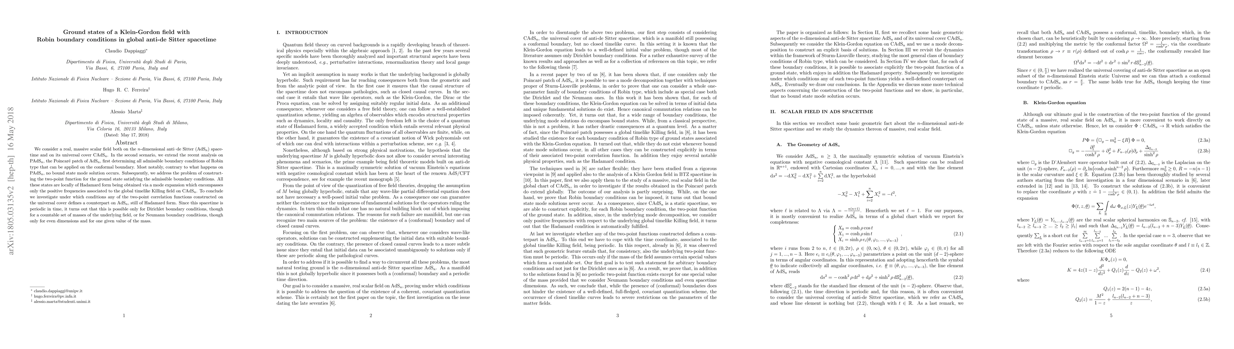 This paper investigates the ground states of a massive scalar field in global anti-de Sitter (AdS$_n$) spacetime and its universal cover CAdS$_n$, focusing on Robin boundary conditions. It finds no bound state modes in CAdS$_n$ and constructs locally Hadamard form two-point functions for the ground state, revealing that only Dirichlet or specific Neumann boundary conditions allow for a counterpart in AdS$_n$.