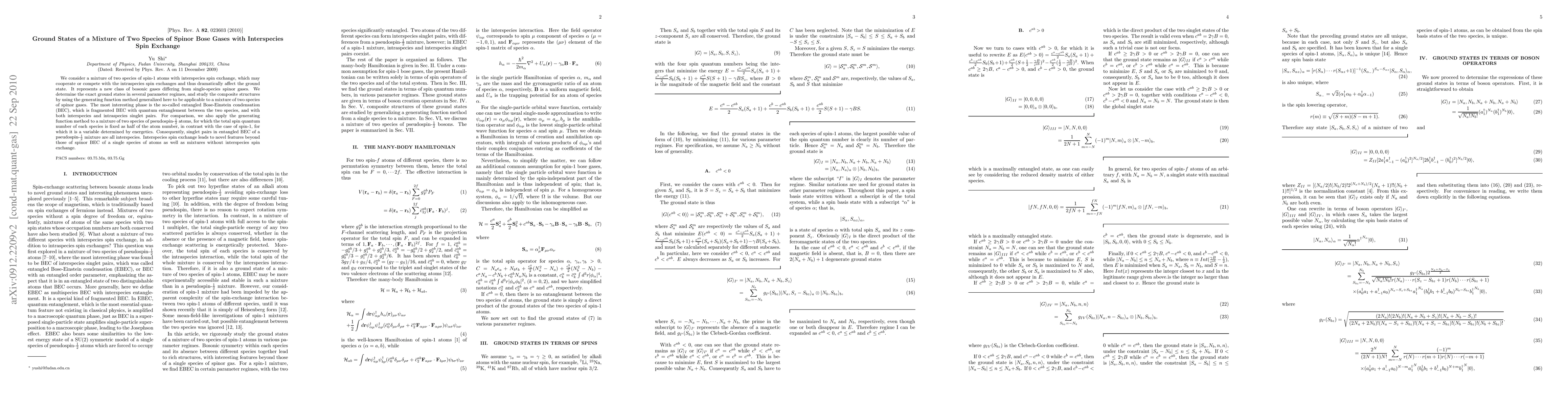 We consider a mixture of two species of spin-1 atoms with interspecies spin exchange, which may cooperate or compete with the intraspecies spin exchanges and thus dramatically affect the ground state. It represents a new class of bosonic gases differing from single-species spinor gases. We determine the exact ground states in several parameter regimes, and study the composite structures by using the generating function method generalized here to be applicable to a mixture of two species of spinor gases. The most interesting phase is the so-called entangled Bose-Einstein condensation (BEC), which is fragmented BEC with quantum entanglement between the two species, and with both interspecies and intraspecies singlet pairs. For comparison, we also apply the generating function method to a mixture of two species of pseudospin-1/2 atoms, for which the total spin quantum number of each species is fixed as half of the atom number, in contrast with the case of spin-1, for which it is a variable determined by energetics. Consequently, singlet pairs in entangled BEC of a pseudospin-1/2 mixture are all interspecies. Interspecies spin exchange leads to novel features beyond those of spinor BEC of a single species of atoms as well as mixtures without interspecies spin exchange.