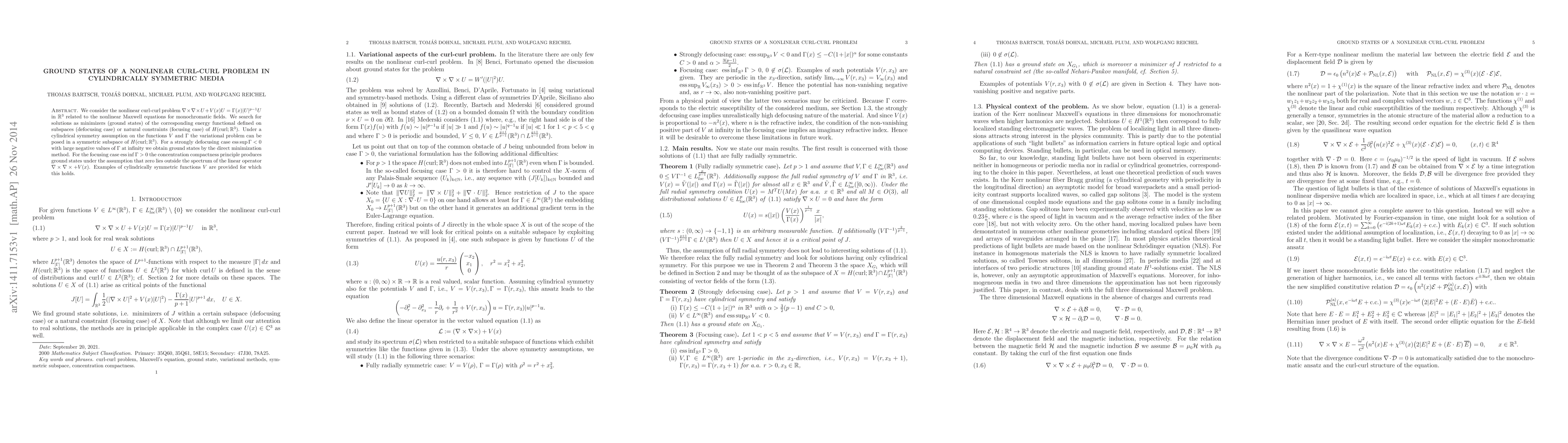 We consider the nonlinear curl-curl problem $\nabla\times\nabla\times U + V(x) U= \Gamma(x)|U|^{p-1}U$ in $\mathbb{R}^3$ related to the nonlinear Maxwell equations for monochromatic fields. We search for solutions as minimizers (ground states) of the corresponding energy functional defined on subspaces (defocusing case) or natural constraints (focusing case) of $H(\mathrm{curl};\mathbb{R}^3)$. Under a cylindrical symmetry assumption on the functions $V$ and $\Gamma$ the variational problem can be posed in a symmetric subspace of $H(\mathrm{curl};\mathbb{R}^3)$. For a strongly defocusing case $\mathrm{esssup}\, \Gamma <0$ with large negative values of $\Gamma$ at infinity we obtain ground states by the direct minimization method. For the focusing case $\mathrm{essinf}\, \Gamma >0$ the concentration compactness principle produces ground states under the assumption that zero lies outside the spectrum of the linear operator $\nabla \times \nabla \times +V(x)$. Examples of cylindrically symmetric functions $V$ are provided for which this holds.