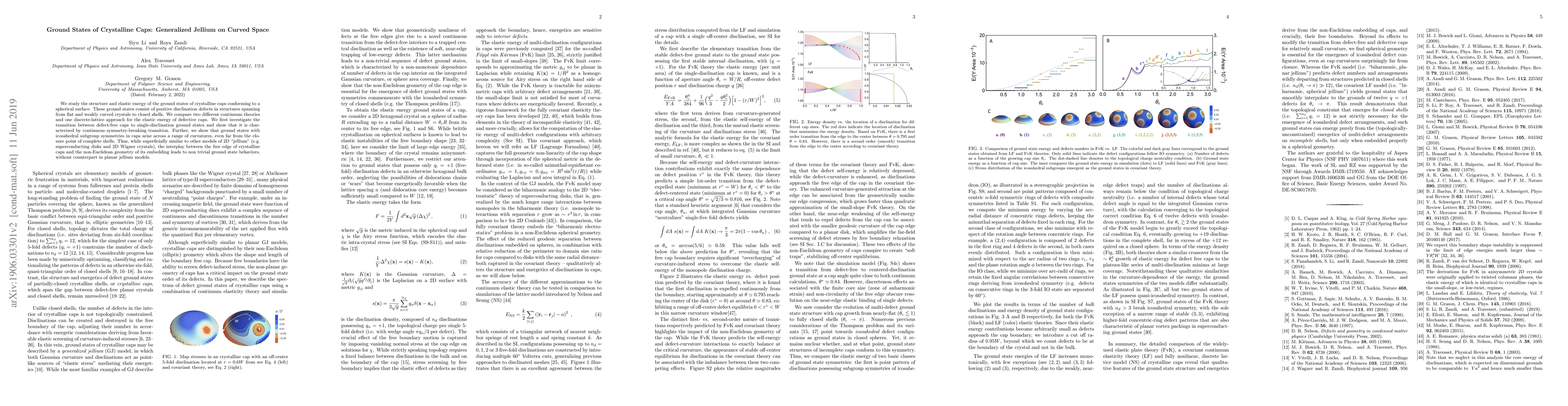 Researchers studied the structure and energy of crystalline caps on curved surfaces, finding unique ground states with icosahedral symmetries that don't occur in flat jellium models.
