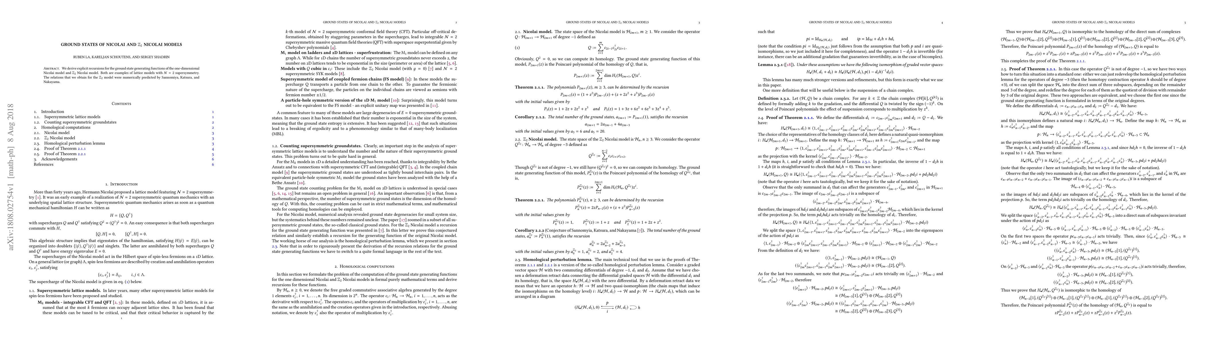 This paper derives explicit recursions for the ground state generating functions of the one-dimensional Nicolai and $\mathbb{Z}_2$ Nicolai models, both featuring $\mathcal{N}=2$ supersymmetry, confirming numerically predicted relations for the $\mathbb{Z}_2$ model by Sannomiya, Katsura, and Nakayama.