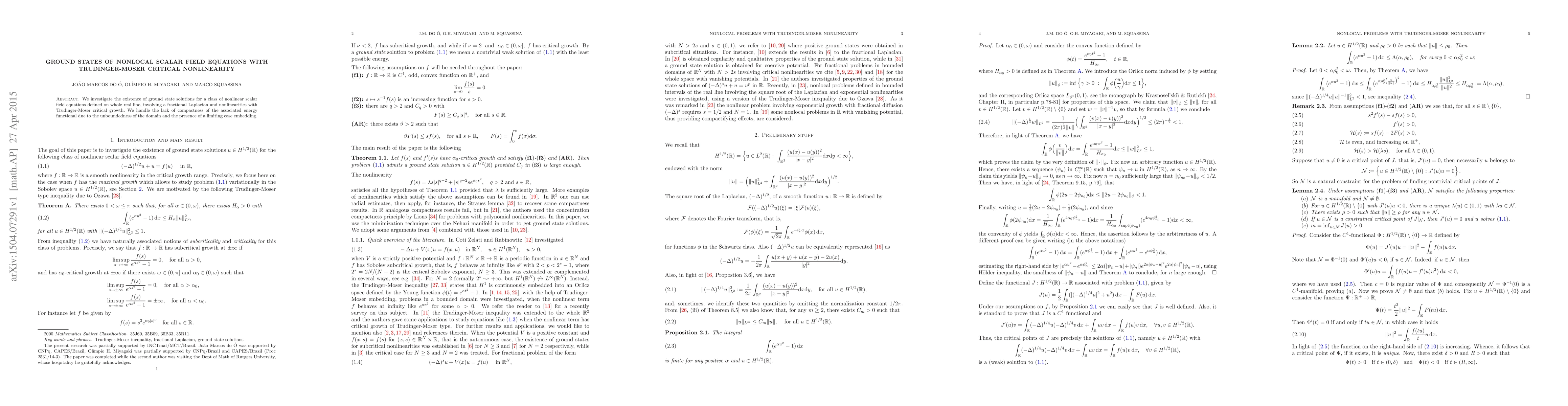 This paper explores the existence of ground state solutions for nonlocal scalar field equations with Trudinger-Moser critical nonlinearity on the whole real line, addressing the challenges posed by the fractional Laplacian and the lack of compactness due to the unbounded domain and limiting case embedding.