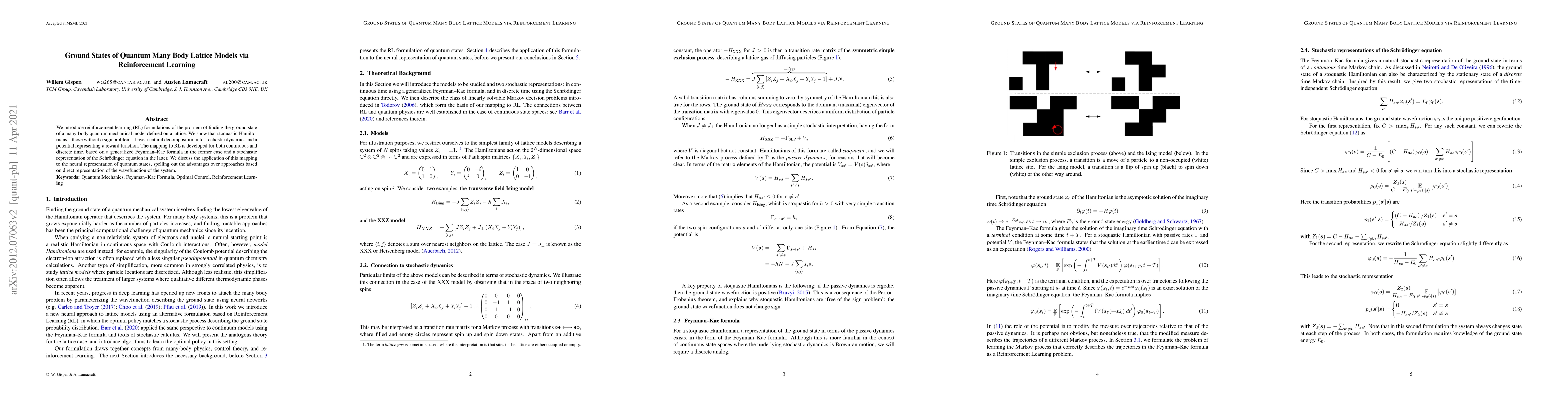 We introduce reinforcement learning (RL) formulations of the problem of finding the ground state of a many-body quantum mechanical model defined on a lattice. We show that stoquastic Hamiltonians - those without a sign problem - have a natural decomposition into stochastic dynamics and a potential representing a reward function. The mapping to RL is developed for both continuous and discrete time, based on a generalized Feynman-Kac formula in the former case and a stochastic representation of the Schr\"odinger equation in the latter. We discuss the application of this mapping to the neural representation of quantum states, spelling out the advantages over approaches based on direct representation of the wavefunction of the system.