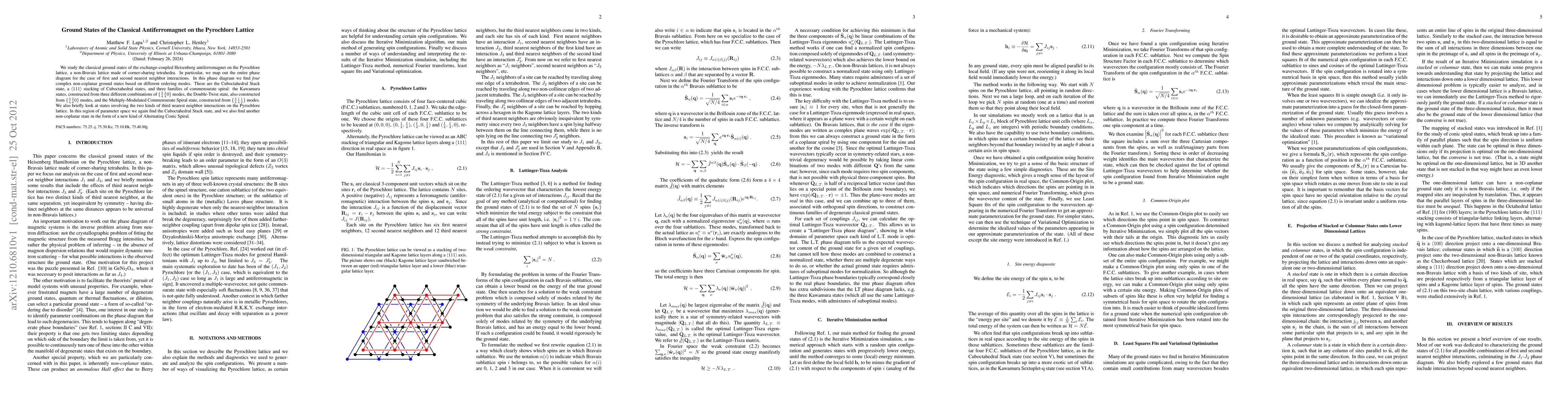 This paper investigates the classical ground states of the Heisenberg antiferromagnet on the Pyrochlore lattice, revealing four complex non-coplanar states including the Cuboctahedral Stack state and three spiral families. It also identifies a new Alternating Conic Spiral state in the presence of third nearest neighbor interactions.