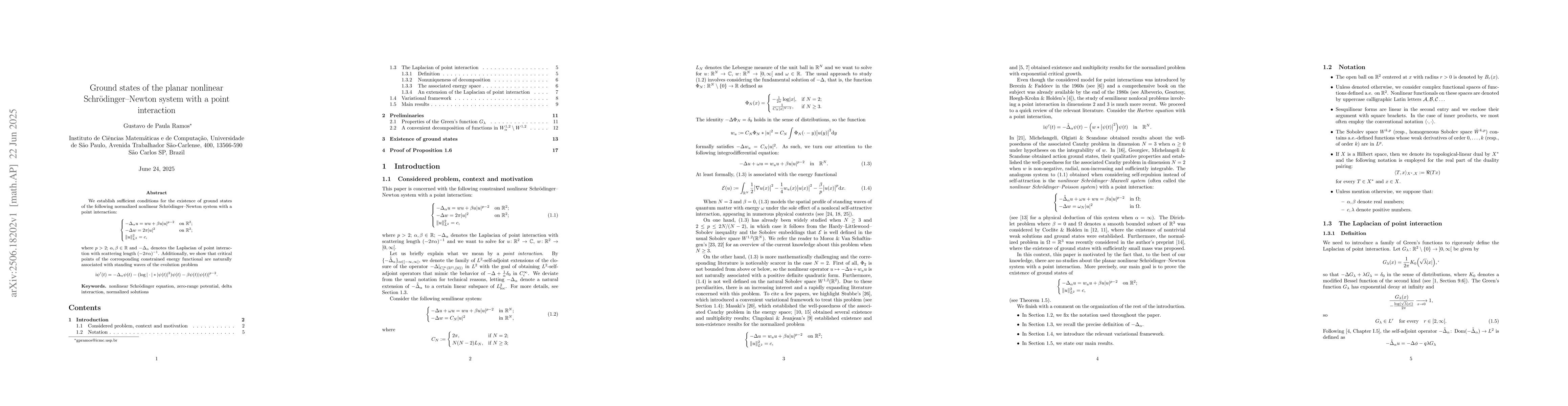 We establish sufficient conditions for the existence of ground states of the following normalized nonlinear Schr\"odinger--Newton system with a point interaction: \[ \begin{cases} - \Delta_\alpha u = w u + \beta u |u|^{p - 2} &\text{on} ~ \mathbb{R}^2; \\ - \Delta w = 2 \pi |u|^2 &\text{on} ~ \mathbb{R}^2; \\ \|u\|_{L^2}^2 = c, \end{cases} \] where $p > 2$; $\alpha, \beta \in \mathbb{R}$ and $- \Delta_\alpha$ denotes the Laplacian of point interaction with scattering length $(- 2 \pi \alpha)^{- 1}$. Additionally, we show that critical points of the corresponding constrained energy functional are naturally associated with standing waves of the evolution problem \[ \mathrm{i} \psi' (t) = - \Delta_\alpha \psi (t) - (\log |\cdot| \ast |\psi (t)|^2) \psi (t) - \beta \psi (t) |\psi (t)|^{p - 2}. \]