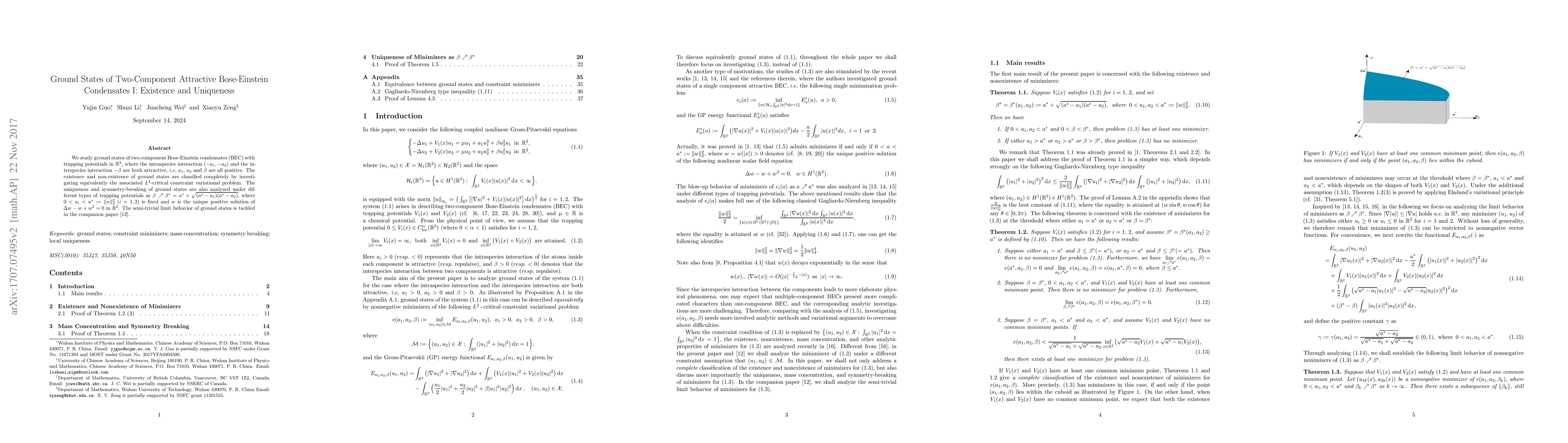 This paper investigates the existence and uniqueness of ground states for two-component attractive Bose-Einstein condensates in $R^2$, classifying these states through an $L^2$-critical constraint variational problem. It also examines symmetry-breaking and uniqueness under varying trapping potentials, with a focus on the critical interaction parameter $\beta^*$.