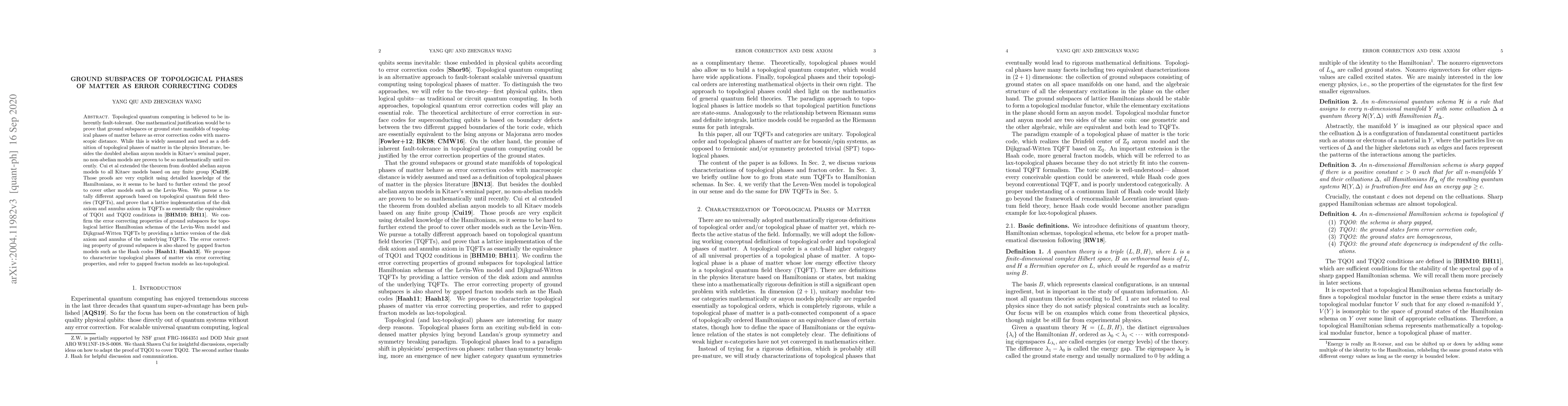 Topological quantum computing is believed to be inherently fault-tolerant. One mathematical justification would be to prove that ground subspaces or ground state manifolds of topological phases of matter behave as error correction codes with macroscopic distance. While this is widely assumed and used as a definition of topological phases of matter in the physics literature, besides the doubled abelian anyon models in Kitaev's seminal paper, no non-abelian models are proven to be so mathematically until recently. Cui et al extended the theorem from doubled abelian anyon models to all Kitaev models based on any finite group. Those proofs are very explicit using detailed knowledge of the Hamiltonians, so it seems to be hard to further extend the proof to cover other models such as the Levin-Wen. We pursue a totally different approach based on topological quantum field theories (TQFTs), and prove that a lattice implementation of the disk axiom and annulus axiom in TQFTs as essentially the equivalence of TQO1 and TQO2 conditions. We confirm the error correcting properties of ground subspaces for topological lattice Hamiltonian schemas of the Levin-Wen model and Dijkgraaf-Witten TQFTs by providing a lattice version of the disk axiom and annulus of the underlying TQFTs. The error correcting property of ground subspaces is also shared by gapped fracton models such as the Haah codes. We propose to characterize topological phases of matter via error correcting properties, and refer to gapped fracton models as lax-topological.