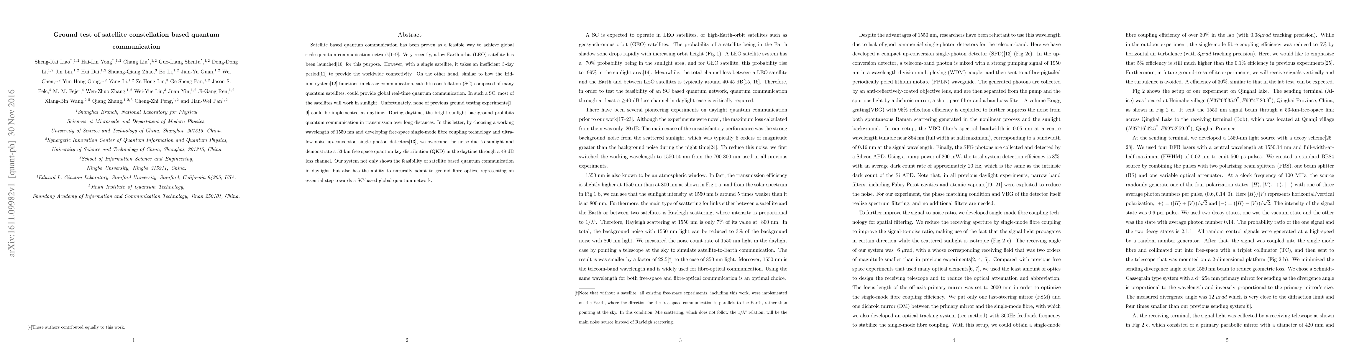 This paper demonstrates a ground test for a satellite constellation-based quantum communication system, overcoming daytime sunlight interference to achieve a 53-km free-space quantum key distribution. The use of a 1550 nm wavelength, coupled with advanced detection technology, signifies a crucial step towards realizing a global quantum communication network.