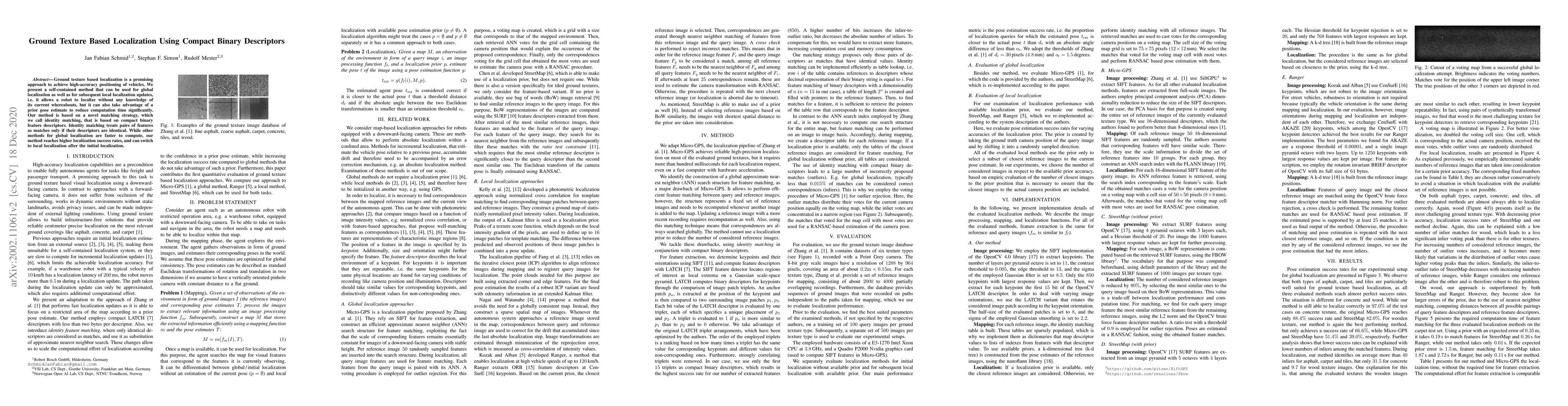 The research presents a self-contained method for ground texture-based localization using a novel identity matching strategy with compact binary feature descriptors, capable of global and local localization.