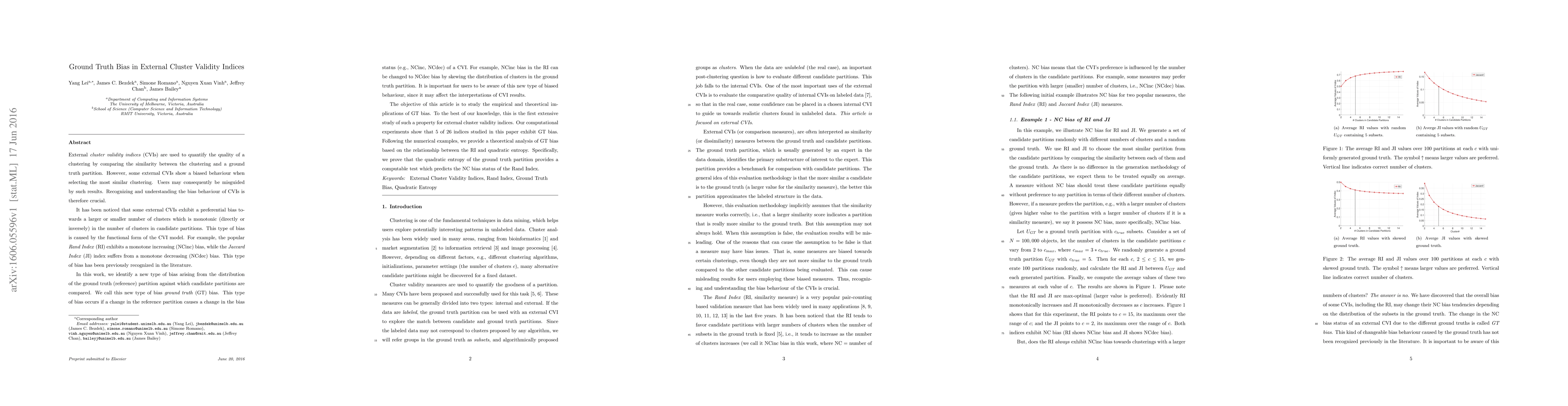 This paper identifies a new type of bias, termed ground truth (GT) bias, in external cluster validity indices (CVIs) that arises from the distribution of the reference partition used for comparison. It highlights how changes in the reference partition can alter the bias status of CVIs, potentially affecting interpretations of their results, and provides an extensive study on the empirical and theoretical implications of this bias.