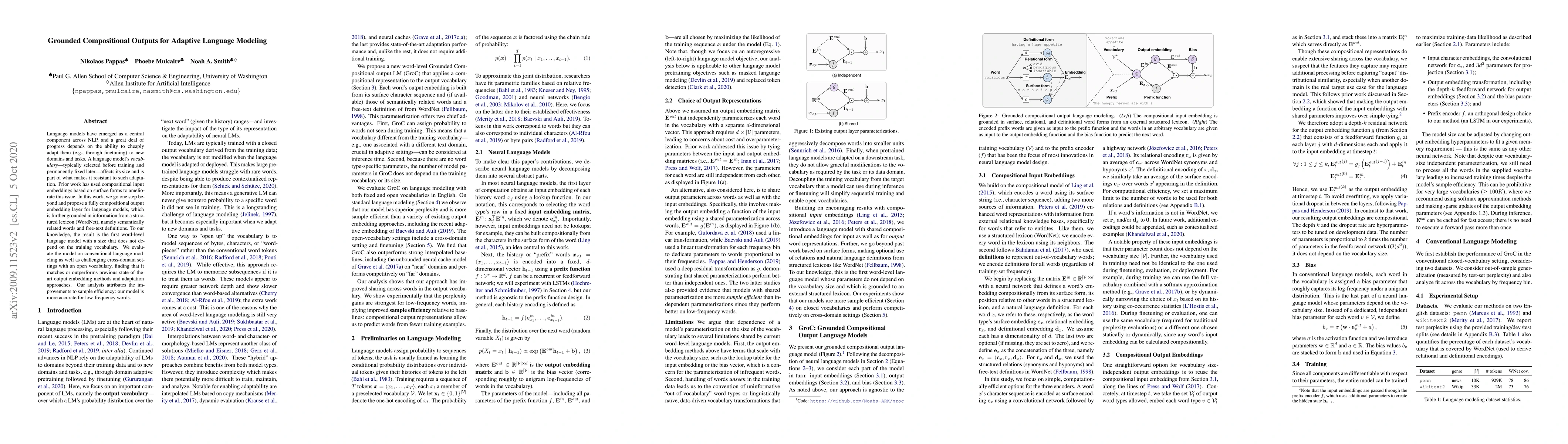 Language models have emerged as a central component across NLP, and a great deal of progress depends on the ability to cheaply adapt them (e.g., through finetuning) to new domains and tasks. A language model's vocabulary$-$typically selected before training and permanently fixed later$-$affects its size and is part of what makes it resistant to such adaptation. Prior work has used compositional input embeddings based on surface forms to ameliorate this issue. In this work, we go one step beyond and propose a fully compositional output embedding layer for language models, which is further grounded in information from a structured lexicon (WordNet), namely semantically related words and free-text definitions. To our knowledge, the result is the first word-level language model with a size that does not depend on the training vocabulary. We evaluate the model on conventional language modeling as well as challenging cross-domain settings with an open vocabulary, finding that it matches or outperforms previous state-of-the-art output embedding methods and adaptation approaches. Our analysis attributes the improvements to sample efficiency: our model is more accurate for low-frequency words.