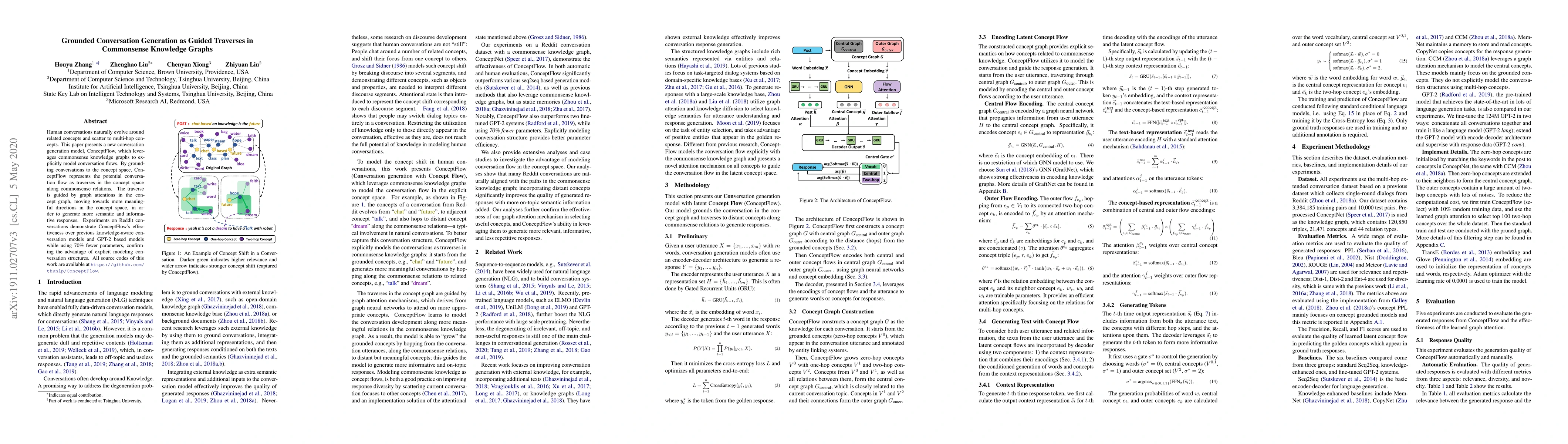 This paper introduces ConceptFlow, a new conversation generation model that leverages commonsense knowledge graphs to model conversation flows as guided traverses in the concept space, achieving more semantic and informative responses with fewer parameters. Experiments show ConceptFlow outperforms previous models on Reddit conversations.