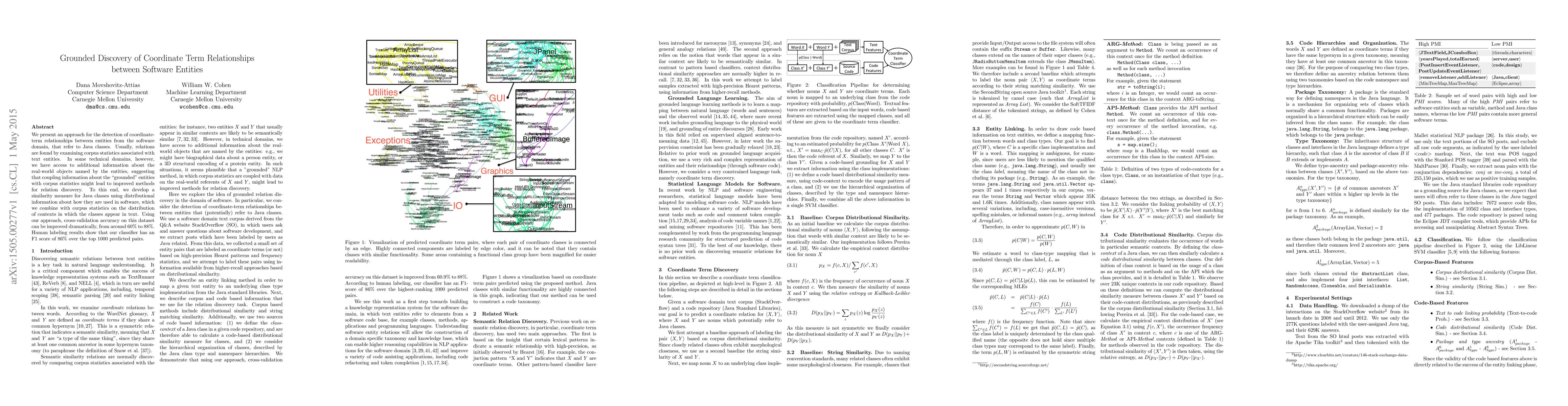 We present an approach for the detection of coordinate-term relationships between entities from the software domain, that refer to Java classes. Usually, relations are found by examining corpus statistics associated with text entities. In some technical domains, however, we have access to additional information about the real-world objects named by the entities, suggesting that coupling information about the "grounded" entities with corpus statistics might lead to improved methods for relation discovery. To this end, we develop a similarity measure for Java classes using distributional information about how they are used in software, which we combine with corpus statistics on the distribution of contexts in which the classes appear in text. Using our approach, cross-validation accuracy on this dataset can be improved dramatically, from around 60% to 88%. Human labeling results show that our classifier has an F1 score of 86% over the top 1000 predicted pairs.