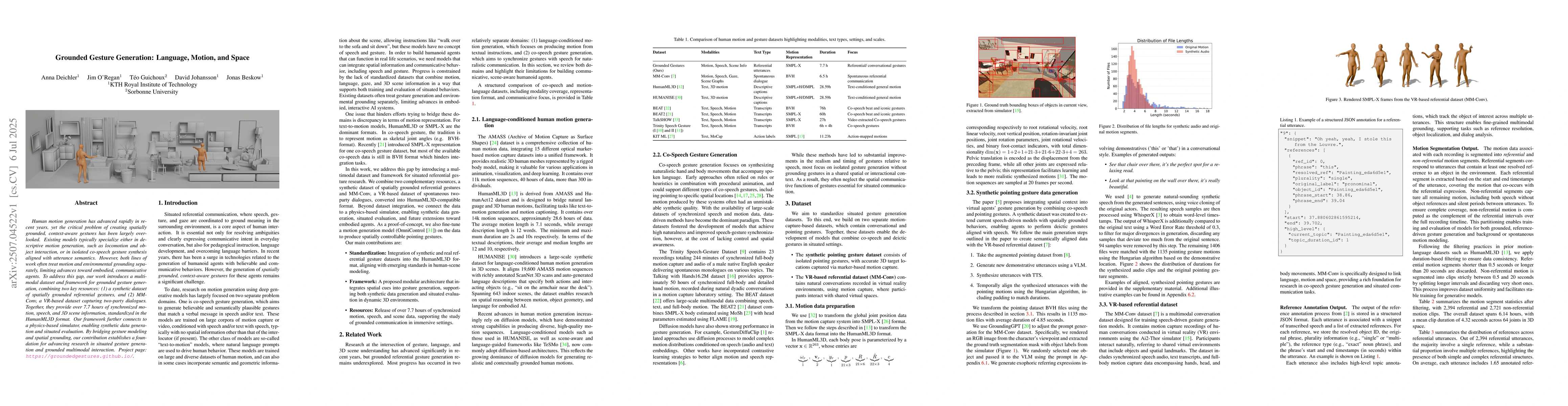 Human motion generation has advanced rapidly in recent years, yet the critical problem of creating spatially grounded, context-aware gestures has been largely overlooked. Existing models typically specialize either in descriptive motion generation, such as locomotion and object interaction, or in isolated co-speech gesture synthesis aligned with utterance semantics. However, both lines of work often treat motion and environmental grounding separately, limiting advances toward embodied, communicative agents. To address this gap, our work introduces a multimodal dataset and framework for grounded gesture generation, combining two key resources: (1) a synthetic dataset of spatially grounded referential gestures, and (2) MM-Conv, a VR-based dataset capturing two-party dialogues. Together, they provide over 7.7 hours of synchronized motion, speech, and 3D scene information, standardized in the HumanML3D format. Our framework further connects to a physics-based simulator, enabling synthetic data generation and situated evaluation. By bridging gesture modeling and spatial grounding, our contribution establishes a foundation for advancing research in situated gesture generation and grounded multimodal interaction. Project page: https://groundedgestures.github.io/