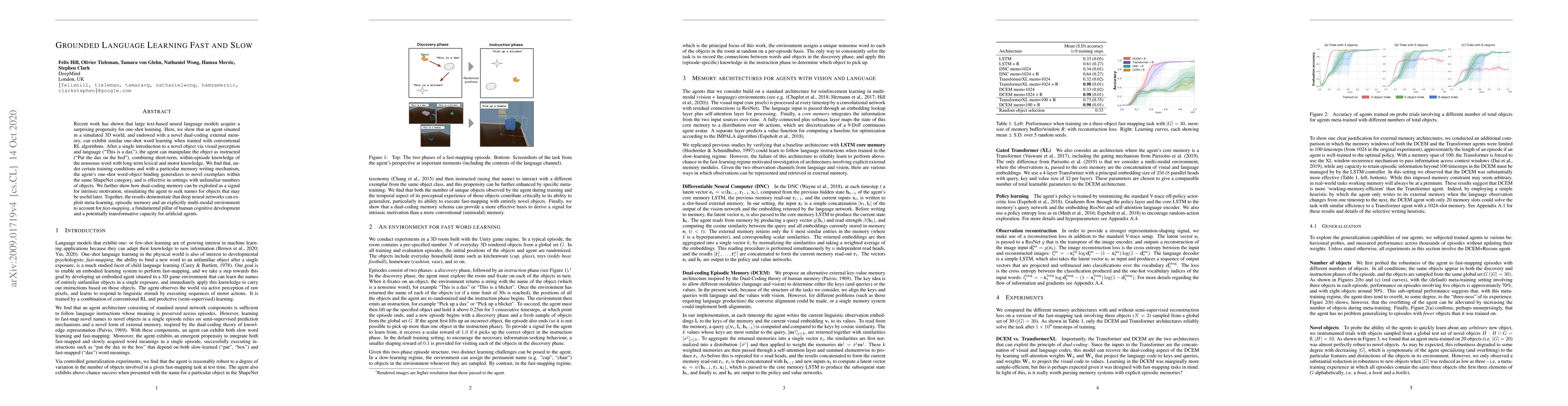 An embodied agent with a dual-coding external memory learns to associate words with objects in a 3D world through reinforcement learning, exhibiting one-shot word learning capabilities.