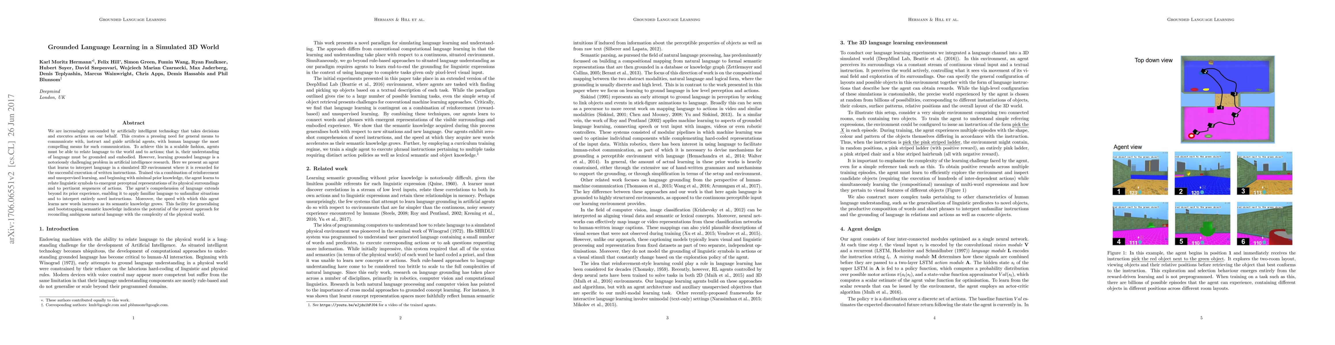 This paper presents an AI agent that learns to interpret language in a simulated 3D world through reinforcement and unsupervised learning, enabling it to relate linguistic symbols to physical actions and generalize to new instructions. The agent's ability to bootstrap and extend its semantic understanding suggests a promising approach for grounding language in the physical world.