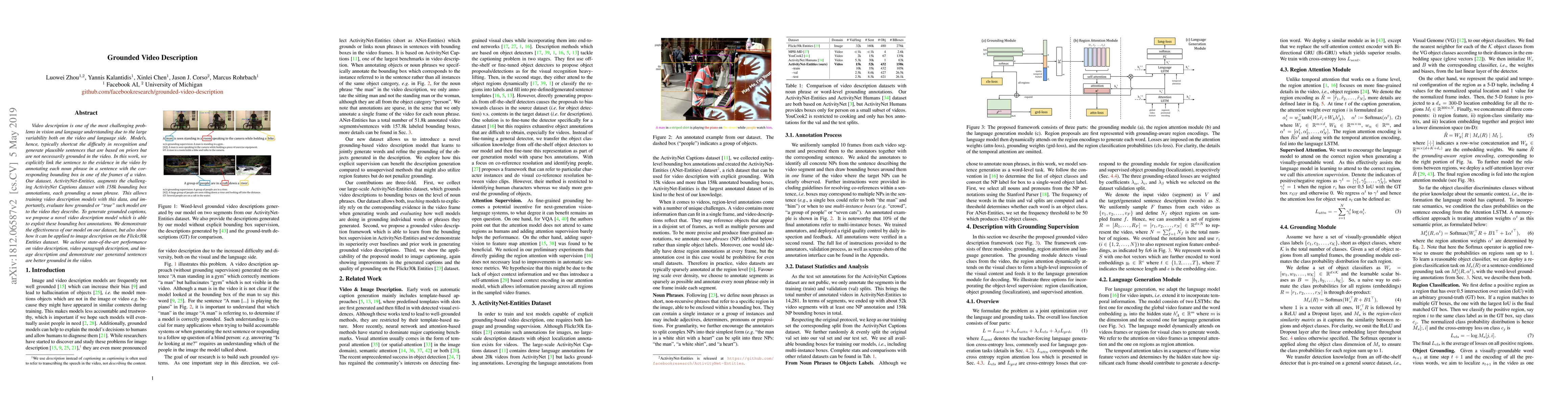 This paper introduces a novel method to generate grounded video descriptions by linking noun phrases in sentences to corresponding bounding boxes in video frames, using the new ActivityNet-Entities dataset. The proposed model achieves state-of-the-art performance in video and image description tasks, demonstrating improved grounding of generated captions to the visual content.