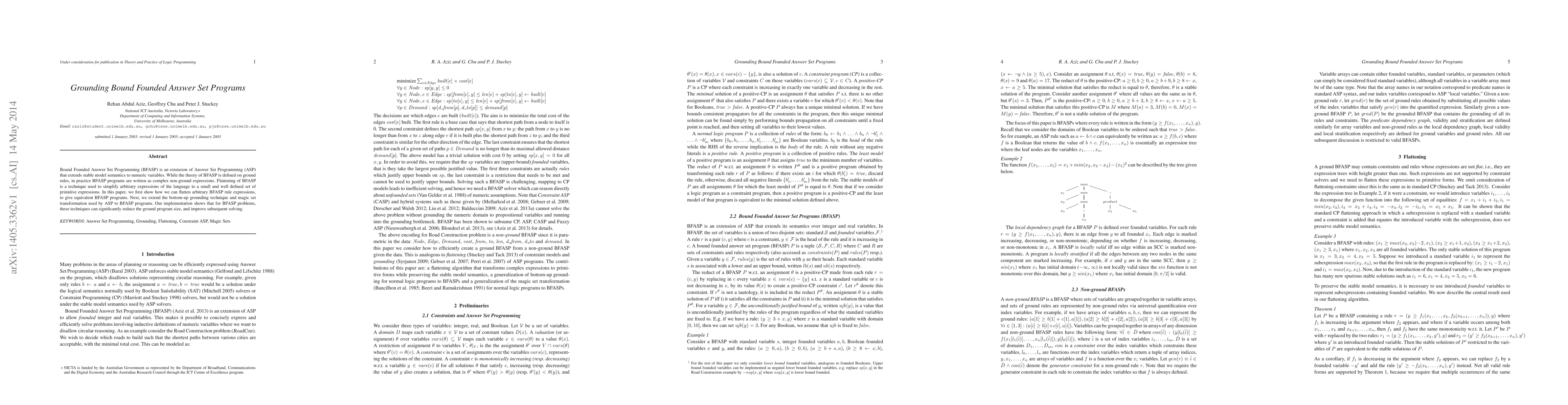 To appear in Theory and Practice of Logic Programming (TPLP) Bound Founded Answer Set Programming (BFASP) is an extension of Answer Set Programming (ASP) that extends stable model semantics to numeric variables. While the theory of BFASP is defined on ground rules, in practice BFASP programs are written as complex non-ground expressions. Flattening of BFASP is a technique used to simplify arbitrary expressions of the language to a small and well defined set of primitive expressions. In this paper, we first show how we can flatten arbitrary BFASP rule expressions, to give equivalent BFASP programs. Next, we extend the bottom-up grounding technique and magic set transformation used by ASP to BFASP programs. Our implementation shows that for BFASP problems, these techniques can significantly reduce the ground program size, and improve subsequent solving.