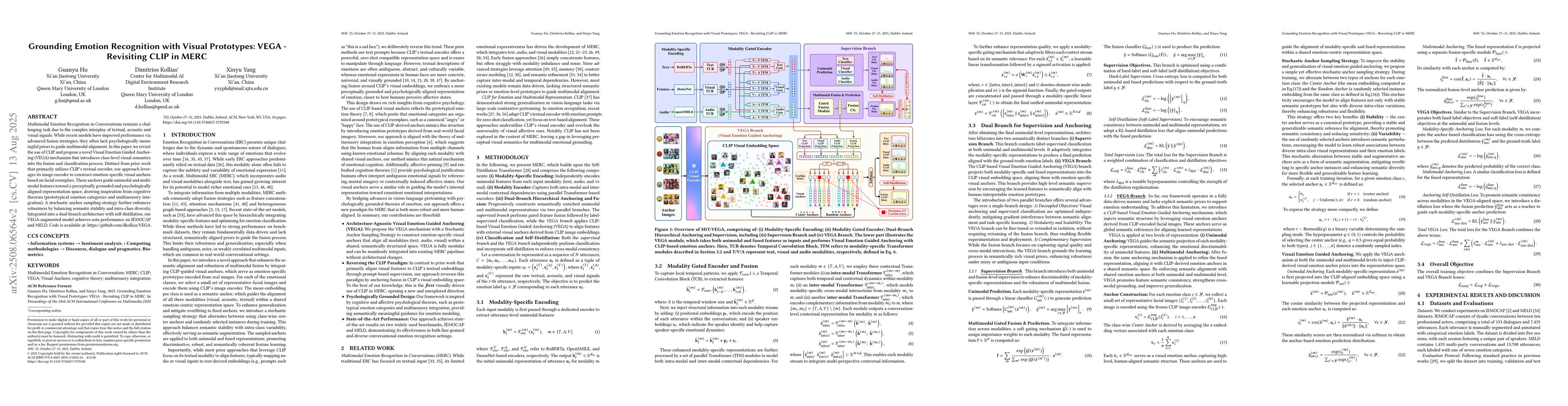 Multimodal Emotion Recognition in Conversations remains a challenging task due to the complex interplay of textual, acoustic and visual signals. While recent models have improved performance via advanced fusion strategies, they often lack psychologically meaningful priors to guide multimodal alignment. In this paper, we revisit the use of CLIP and propose a novel Visual Emotion Guided Anchoring (VEGA) mechanism that introduces class-level visual semantics into the fusion and classification process. Distinct from prior work that primarily utilizes CLIP's textual encoder, our approach leverages its image encoder to construct emotion-specific visual anchors based on facial exemplars. These anchors guide unimodal and multimodal features toward a perceptually grounded and psychologically aligned representation space, drawing inspiration from cognitive theories (prototypical emotion categories and multisensory integration). A stochastic anchor sampling strategy further enhances robustness by balancing semantic stability and intra-class diversity. Integrated into a dual-branch architecture with self-distillation, our VEGA-augmented model achieves sota performance on IEMOCAP and MELD. Code is available at: https://github.com/dkollias/VEGA.