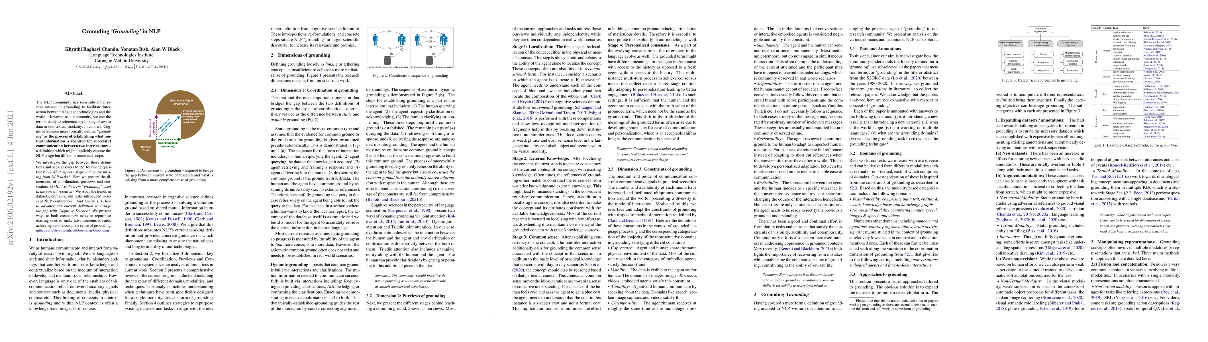 The NLP community has seen substantial recent interest in grounding to facilitate interaction between language technologies and the world. However, as a community, we use the term broadly to reference any linking of text to data or non-textual modality. In contrast, Cognitive Science more formally defines "grounding" as the process of establishing what mutual information is required for successful communication between two interlocutors -- a definition which might implicitly capture the NLP usage but differs in intent and scope. We investigate the gap between these definitions and seek answers to the following questions: (1) What aspects of grounding are missing from NLP tasks? Here we present the dimensions of coordination, purviews and constraints. (2) How is the term "grounding" used in the current research? We study the trends in datasets, domains, and tasks introduced in recent NLP conferences. And finally, (3) How to advance our current definition to bridge the gap with Cognitive Science? We present ways to both create new tasks or repurpose existing ones to make advancements towards achieving a more complete sense of grounding.