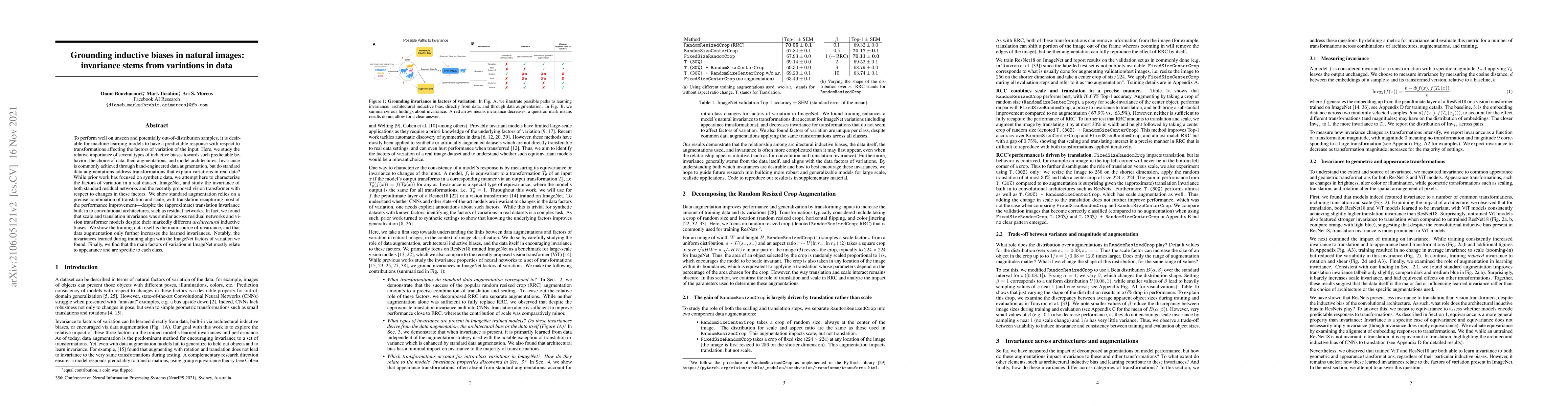 To perform well on unseen and potentially out-of-distribution samples, it is desirable for machine learning models to have a predictable response with respect to transformations affecting the factors of variation of the input. Here, we study the relative importance of several types of inductive biases towards such predictable behavior: the choice of data, their augmentations, and model architectures. Invariance is commonly achieved through hand-engineered data augmentation, but do standard data augmentations address transformations that explain variations in real data? While prior work has focused on synthetic data, we attempt here to characterize the factors of variation in a real dataset, ImageNet, and study the invariance of both standard residual networks and the recently proposed vision transformer with respect to changes in these factors. We show standard augmentation relies on a precise combination of translation and scale, with translation recapturing most of the performance improvement -- despite the (approximate) translation invariance built in to convolutional architectures, such as residual networks. In fact, we found that scale and translation invariance was similar across residual networks and vision transformer models despite their markedly different architectural inductive biases. We show the training data itself is the main source of invariance, and that data augmentation only further increases the learned invariances. Notably, the invariances learned during training align with the ImageNet factors of variation we found. Finally, we find that the main factors of variation in ImageNet mostly relate to appearance and are specific to each class.