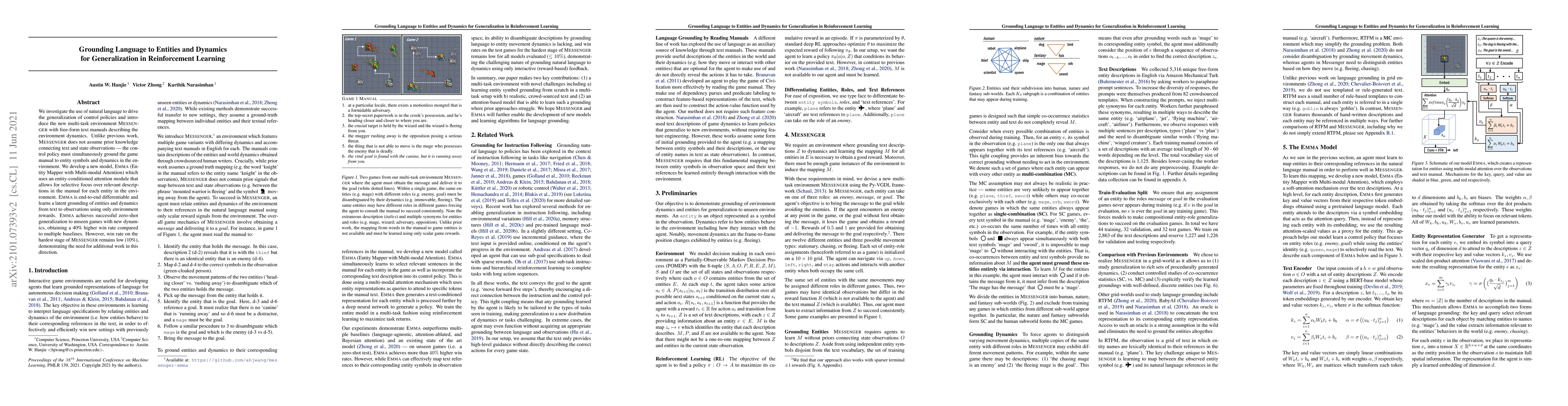 We investigate the use of natural language to drive the generalization of control policies and introduce the new multi-task environment Messenger with free-form text manuals describing the environment dynamics. Unlike previous work, Messenger does not assume prior knowledge connecting text and state observations $-$ the control policy must simultaneously ground the game manual to entity symbols and dynamics in the environment. We develop a new model, EMMA (Entity Mapper with Multi-modal Attention) which uses an entity-conditioned attention module that allows for selective focus over relevant descriptions in the manual for each entity in the environment. EMMA is end-to-end differentiable and learns a latent grounding of entities and dynamics from text to observations using only environment rewards. EMMA achieves successful zero-shot generalization to unseen games with new dynamics, obtaining a 40% higher win rate compared to multiple baselines. However, win rate on the hardest stage of Messenger remains low (10%), demonstrating the need for additional work in this direction.