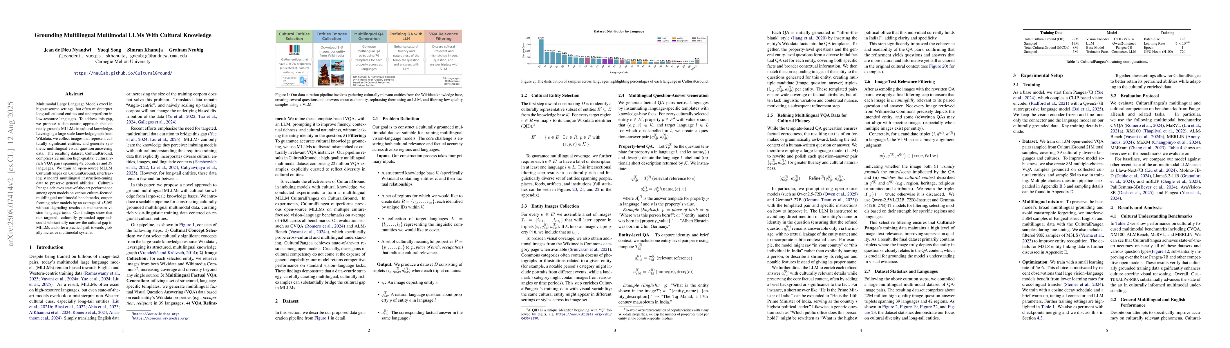 The paper proposes a data-centric approach to ground multilingual multimodal LLMs in cultural knowledge by leveraging a large-scale knowledge graph from Wikidata, collecting culturally significant images, and generating synthetic multilingual VQA data. The dataset, CulturalGround, comprises 22 million high-quality, culturally-rich VQA pairs across 42 countries and 39 languages.