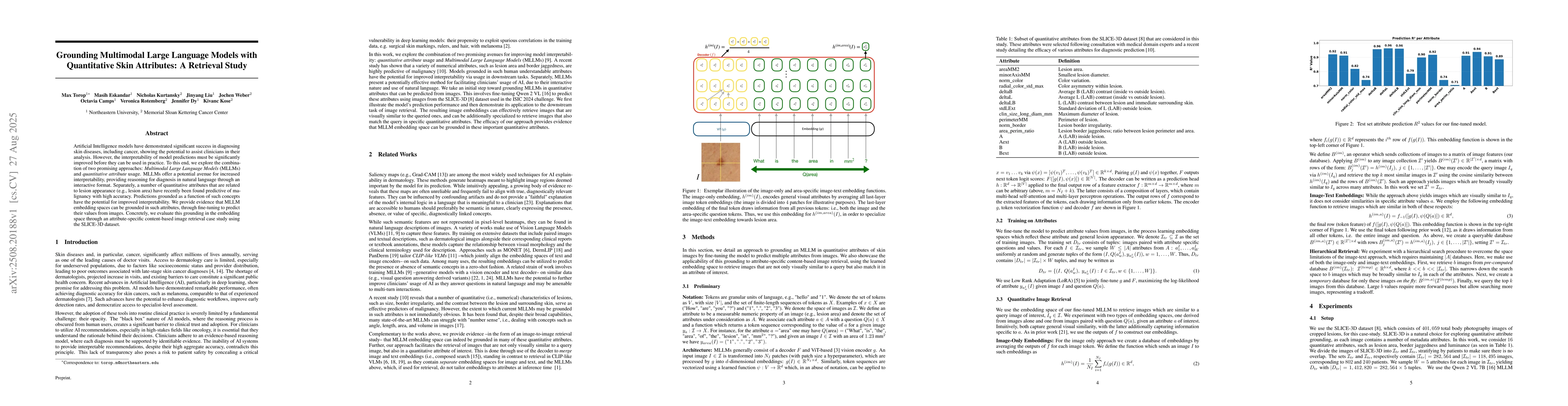 Artificial Intelligence models have demonstrated significant success in diagnosing skin diseases, including cancer, showing the potential to assist clinicians in their analysis. However, the interpretability of model predictions must be significantly improved before they can be used in practice. To this end, we explore the combination of two promising approaches: Multimodal Large Language Models (MLLMs) and quantitative attribute usage. MLLMs offer a potential avenue for increased interpretability, providing reasoning for diagnosis in natural language through an interactive format. Separately, a number of quantitative attributes that are related to lesion appearance (e.g., lesion area) have recently been found predictive of malignancy with high accuracy. Predictions grounded as a function of such concepts have the potential for improved interpretability. We provide evidence that MLLM embedding spaces can be grounded in such attributes, through fine-tuning to predict their values from images. Concretely, we evaluate this grounding in the embedding space through an attribute-specific content-based image retrieval case study using the SLICE-3D dataset.