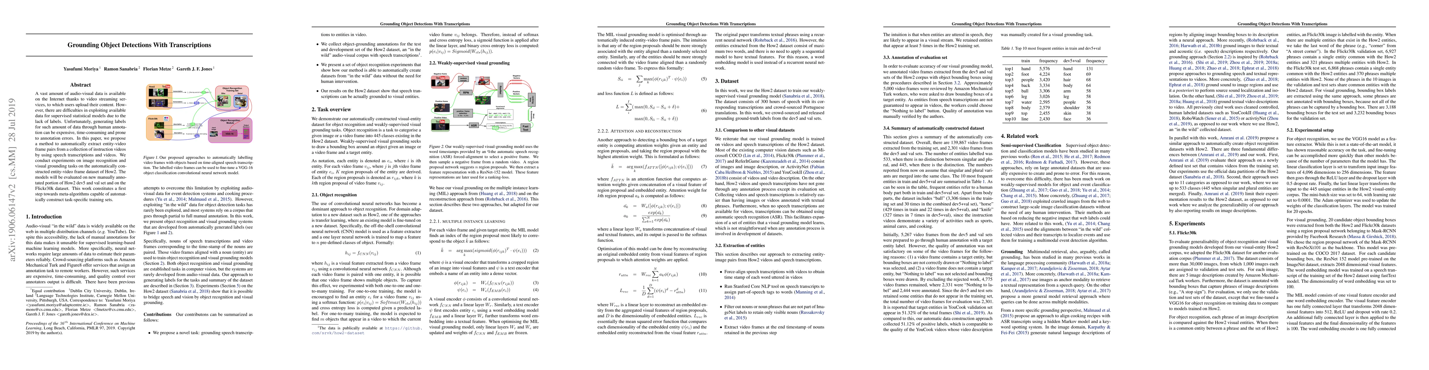 A vast amount of audio-visual data is available on the Internet thanks to video streaming services, to which users upload their content. However, there are difficulties in exploiting available data for supervised statistical models due to the lack of labels. Unfortunately, generating labels for such amount of data through human annotation can be expensive, time-consuming and prone to annotation errors. In this paper, we propose a method to automatically extract entity-video frame pairs from a collection of instruction videos by using speech transcriptions and videos. We conduct experiments on image recognition and visual grounding tasks on the automatically constructed entity-video frame dataset of How2. The models will be evaluated on new manually annotated portion of How2 dev5 and val set and on the Flickr30k dataset. This work constitutes a first step towards meta-algorithms capable of automatically construct task-specific training sets.