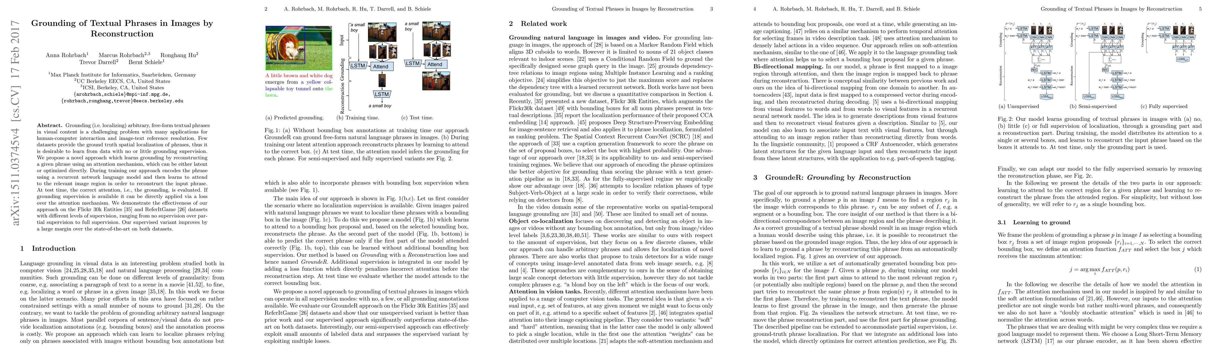 Grounding (i.e. localizing) arbitrary, free-form textual phrases in visual content is a challenging problem with many applications for human-computer interaction and image-text reference resolution. Few datasets provide the ground truth spatial localization of phrases, thus it is desirable to learn from data with no or little grounding supervision. We propose a novel approach which learns grounding by reconstructing a given phrase using an attention mechanism, which can be either latent or optimized directly. During training our approach encodes the phrase using a recurrent network language model and then learns to attend to the relevant image region in order to reconstruct the input phrase. At test time, the correct attention, i.e., the grounding, is evaluated. If grounding supervision is available it can be directly applied via a loss over the attention mechanism. We demonstrate the effectiveness of our approach on the Flickr 30k Entities and ReferItGame datasets with different levels of supervision, ranging from no supervision over partial supervision to full supervision. Our supervised variant improves by a large margin over the state-of-the-art on both datasets.