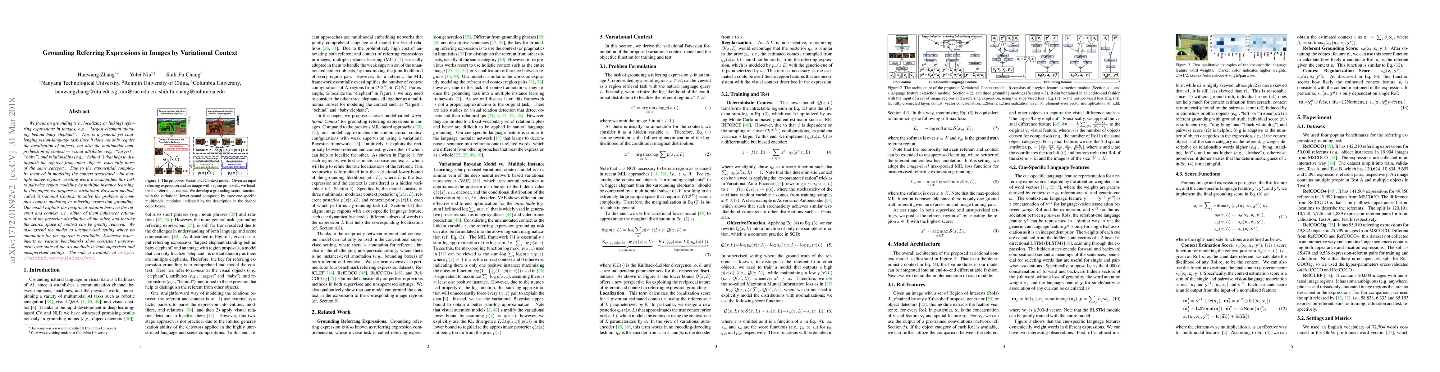 This paper proposes a variational Bayesian method called Variational Context to ground referring expressions in images by modeling complex context through a reciprocal relation between referents and context. The method improves localization accuracy and extends to an unsupervised setting, demonstrating consistent improvements over state-of-the-art methods.