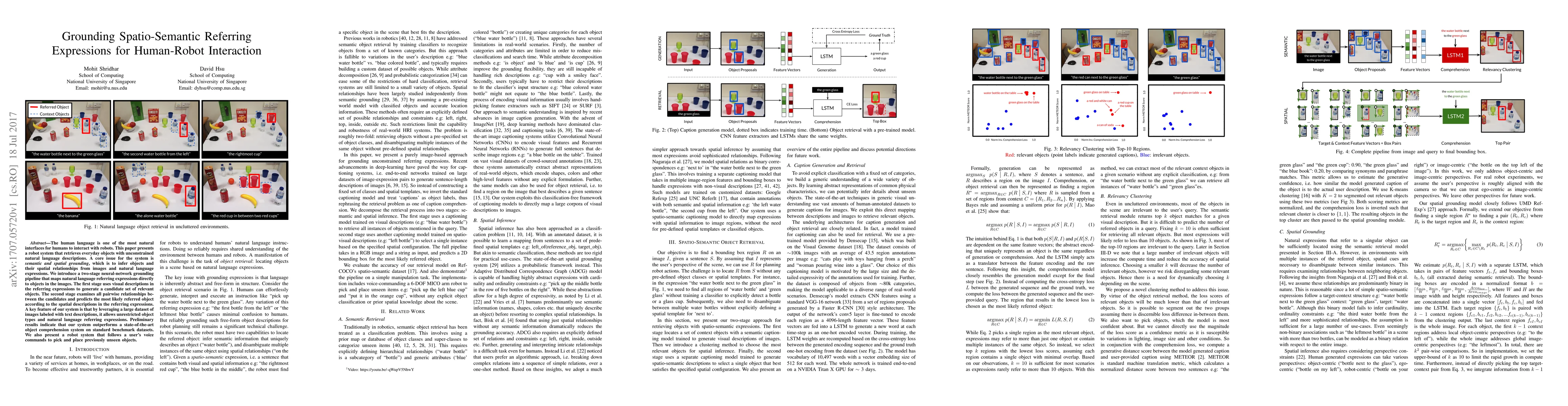 The human language is one of the most natural interfaces for humans to interact with robots. This paper presents a robot system that retrieves everyday objects with unconstrained natural language descriptions. A core issue for the system is semantic and spatial grounding, which is to infer objects and their spatial relationships from images and natural language expressions. We introduce a two-stage neural-network grounding pipeline that maps natural language referring expressions directly to objects in the images. The first stage uses visual descriptions in the referring expressions to generate a candidate set of relevant objects. The second stage examines all pairwise relationships between the candidates and predicts the most likely referred object according to the spatial descriptions in the referring expressions. A key feature of our system is that by leveraging a large dataset of images labeled with text descriptions, it allows unrestricted object types and natural language referring expressions. Preliminary results indicate that our system outperforms a near state-of-the-art object comprehension system on standard benchmark datasets. We also present a robot system that follows voice commands to pick and place previously unseen objects.